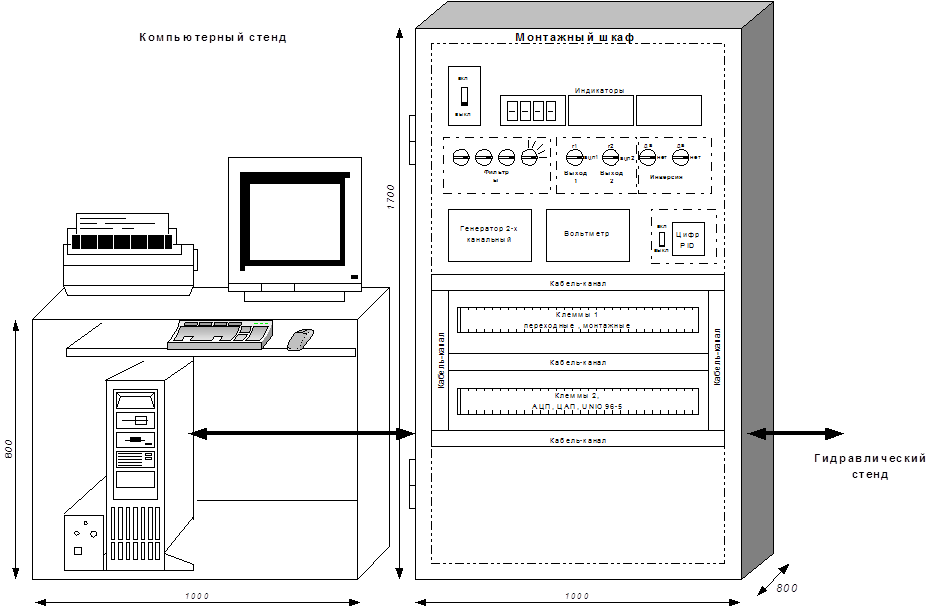 Рисунок 8.1 – Внешний вид модуля управления стендом испытания гидроаппаратуры. Все необходимое для работы выведено на лицевую панель (дверь) монтажного шкафа. 1.4) Повышенная или пониженная температура воздуха рабочей зоны. Лаборатория имеет автоматическую систему поддержания температуры воздуха в пределах, соответствующих группе 2 по ГОСТ 22261-76, с помощью кондиционеров и обогревателей. 1.5) Повышенный уровень шума на рабочем месте. Основным источником шума является компьютерное оборудование. Воздействие шума отражается как на органах слуха, так и на общем психологическом состоянии человека. Возможны глухота, нервные расстройства. 1.6) Повышенный уровень вибрации. Источников вибрации нет. 1.7) Повышенный уровень инфра-, ультразвуковых колебаний Источников колебаний нет. 1.8) Повышенное или пониженное барометрическое давление в рабочей зоне и его резкое изменение. Модуль управления не оказывает влияния на барометрическое давление. 1.9) Повышенная или пониженная влажность воздуха. Модуль управления не оказывает влияния на влажность воздуха. 1.10) Повышенная или пониженная подвижность воздуха. Модуль управления располагается в лаборатории. Под него специально отведено место. Высота лаборатории четыре метра. Поэтому нет преграды для нормальной циркуляции воздуха. Повышенная циркуляция воздуха возможна при неправильной настройке вытяжной вентиляции в лаборатории. 1.11) Повышенная или пониженная ионизация воздуха. Воздух в помещениях, где много людей и вычислительной техники, насыщен положительно заряженными ионами кислорода. В то время как А.Л. Чижевский доказал необходимость для жизнедеятельности организма отрицательно заряженного кислорода воздуха. Повышенное содержание положительно заряженных ионов приводит к ухудшению здоровья, угнетению нервной системы, наступает недостаток кислорода, который необходим глазам, мышцам /4 БЖД/. 1.12) Повышенное значение напряжения в электрической цепи, замыкание которой может произойти через тело человека. Питание модуля управления осуществляется от напряжения 220 В частотой 50 Гц. Монтаж исключает соприкосновение инженера-исследователя с токоведущими частями. Режим сети – с заземленной нейтралью. Для обеспечения электробезопасности применяется защитное зануление. 1.13) Повышенный уровень статического электричества. Эксперты полагают, что низковольтный разряд способен изменить/прервать клеточное развитие. Также происходит положительный заряд частиц пыли, что повышает вероятность возникновения дерматитов лица и открытых частей кожи (прыщи, зуд, экземы) /4 БЖД/. 1.14) Повышенный уровень электромагнитных излучений. В модуле управления основным источником электромагнитного излучения является монитор компьютера. В случае нахождения источника излучения в непосредственной близости от человека, возможны патологические изменения в органах зрения, нарушение обмена веществ. 1.15) Отсутствие или недостаток естественного света, недостаточное освещение рабочего места. Причина возникновения заключается в несоответствии естественного и искусственного освещения установленным нормам. Слабое освещение приводит к напряжению глаз, что при длительном воздействии ведет к ухудшению зрения. Также возникает головная боль, нервное напряжение. 2) Биологические опасные и вредные производственные факто