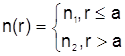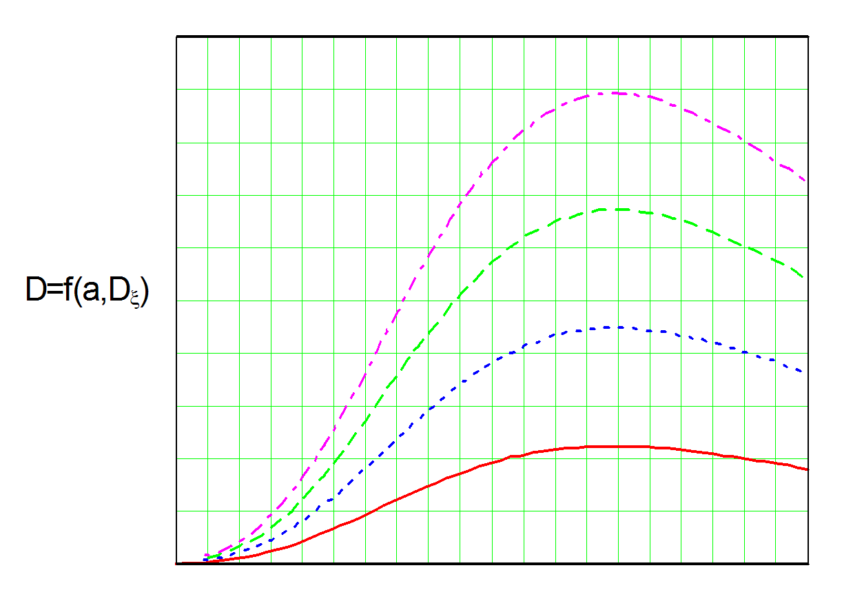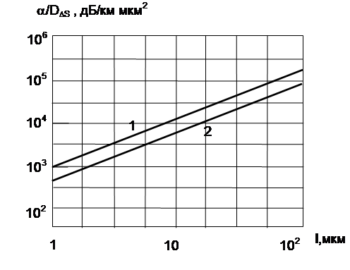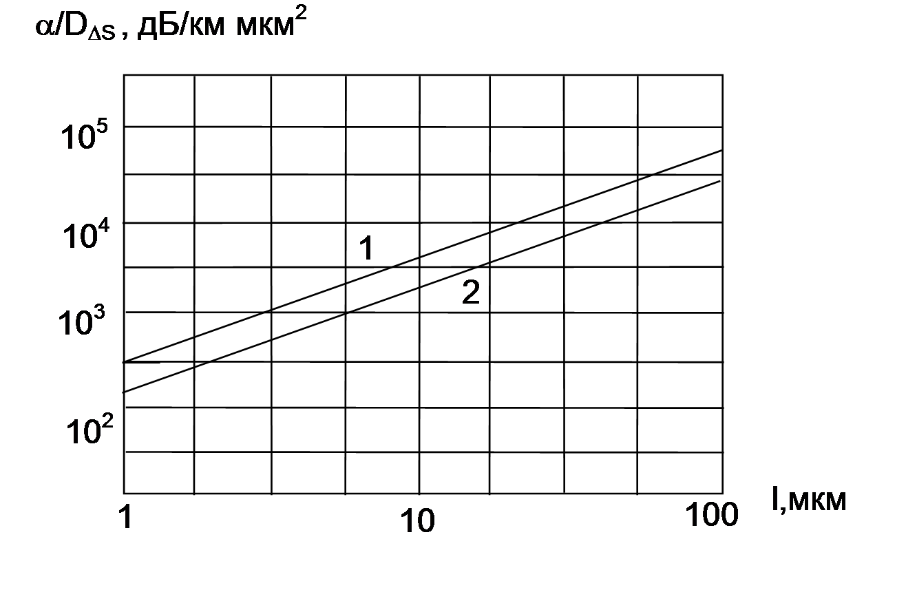 Кинематическая теория. 1. 4. 6. 7. Зависимость коэффициента затухания от радиуса корреляции нерегулярностей функции профиля показателя сердцевины : 1 - для ступенчатого профиля; 2 - для гауссова профиля. (n1=1.5; D=0.01;l=1.3 мкм; V=2.4;a=2.3 мкм)