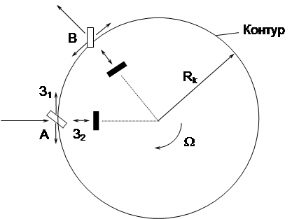 Оптический гироскоп относится к классу приборов, в которых в замкнутом оптическом контуре распространяются встречно бегущие световые лучи. Принцип действия оптического гироскопа основан на «вихревом» эффекте Саньяка, открытым этим ученым в 1913 г. [1]. Сущность вихревого эффекта заключается в следующем. Если в замкнутом оптическом контуре в противоположных направлениях распространяются два световых луча, то при неподвижном контуре фазовые набеги обоих лучей, прошедших весь контур, будут одинаковыми. При вращении контура вокруг оси, нормальной к плоскости контура, фазовые набеги лучей неодинаковы, а разность фаз лучей пропорциональна угловой скорости вращения контура. Для объяснения вихревого эффекта Саньяка разработаны три теории: кинематическая, доплеровская и релятивистская . Наиболее простая из них - кинематическая, наиболее строгая - релятивистская, основанная на общей теории относительности. Рассмотрим вихревой эффект Саньяка в рамках кинематической теории.