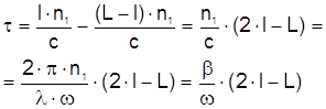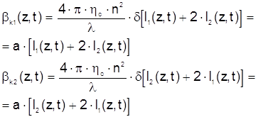 Эти соотношения справедливы для любого закона временной модуляции интенсивности источника излучения. Первый член в квадратных скобках каждого соотношения описывает «само-эффект», который пропорционален интенсивности света на выходе волоконного контура в момент t. Второй член описывает «кросс-эффект». Он не зависит от времени, если удвоенное групповое время распространения луча в контуре, 2t , равно целому числу периодов модуляции интенсивности (в дальнейшем предполагается, что это условие выполняется). Невзаимная разность фаз двух лучей, обусловленная действием нелинейного эффекта Керра: