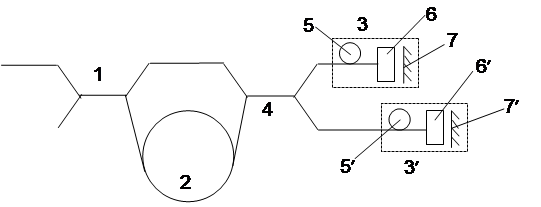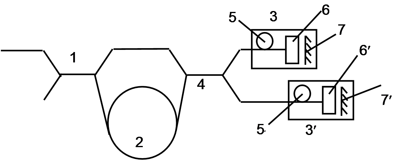 1,4 -направленные ответвители; 2-волоконный контур; 3,3`-отражательные фазовые модуляторы; 5,5`-модулирующие отрезки волокна; 6,6`-ячейки Фарадея с углом вращения 45°; 7,7`-зеркала. Минимальная конфигурация ВОГ
