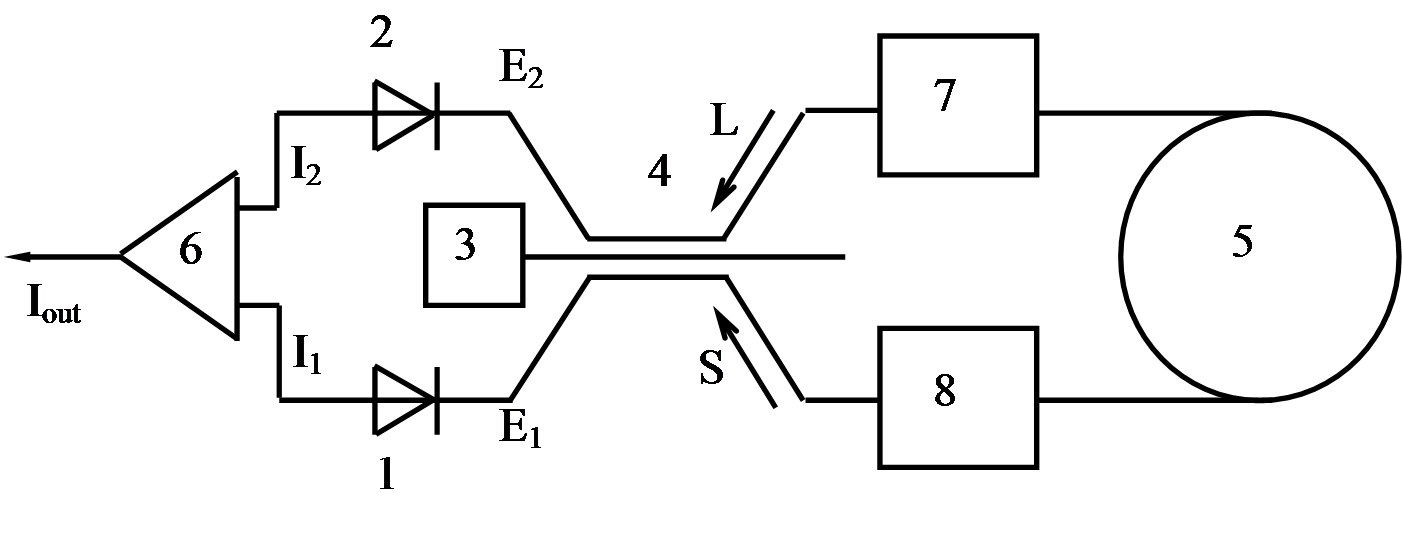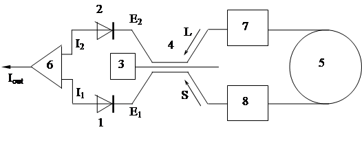 L=A×exp(i×j)×exp(-i×j0) S=A×exp(i×j)×exp(i×j0) на фотодетекторах: E1 = S+exp(i×j1×L) E2 = L+exp(i×j1×S) I1 = |S|2+|L|2+exp(i×j1)×L×S*+exp(-i×j1)×S×L*+n1 I2 = |S|2+|L|2+exp(i×j1)×S×L*+exp(-i×j1)×L×S*+n2 Iout = 2|A|2×sin(j1)×sin(2×j0)+n1-n2