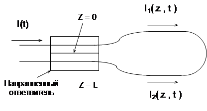 равной Ошибка измерения угловой скорости вращения контура за счет обратного рэлеевского рассеяния может быть минимизирована уменьшением степени взаимной когерентности между первичной и рассеянной волнами. Она может быть уменьшена снижением величины проинтерферировавшей с прямой волной мощности обратнорассеянной волны. Уменьшение когерентности можно реализовать с помощью фазовой модуляции первичной волны, что рандомизирует фазы обратнорассеянных волн. Изменения окружающих условий и уменьшение длины когерентности источника излучения также могут сыграть роль в уменьшении влияния эффектов обратного рэлеевского рассеяния. Однако, даже с учетом выше указанных моментов, неопределенность в измерениях угловой скорости, обусловленная обратным рассеянием, может составлять значительную величину (намного больше фотонного предела). Величину мощности обратнорассеянной волны, интерферирующей с прямой волной, можно значительно уменьшить используя импульсный сигнал, длительность которого значительно короче времени распространения луча в контуре t . Это уменьшение имеет место вследствие того, что в любой данный момент короткий импульс локализуется в соответственно коротком сегменте волоконного контура. В результате лишь часть поля обратнорассеянной волны может приходить на выход в совпадении с прямым сигнальным импульсом. (рис 3.5.). Несовпадающее с импульсом обратнорассеянное поле может быть исключено временным стробированием. Использование короткого импульса не только значительно снижает уровень мощности обратнорассеянного излучения при совпадении (примерно в 1000 раз при длительности импульса = 5 нс в контуре длиной 1000 м), но и позволяет определить расположение сегмента волоконного контура, где это излучение «зарождается». Обратнорассеянное излучение, обнаруживаемое в течение интервала