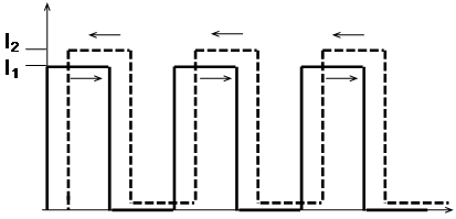 Рис 3.6. Встречно бегущие прямоугольные волны неравной интенсивности. Как видно из рисунка, кросс-эффект имеет место, когда интенсивности двух волн совпадают, при несовпадении кросс-эффект отсутствует. Каждая дискретная часть каждой волны «проявляет» само-эффект в течение всего времени при движении по длине контура L, а половину этого временного интервала проявляется кросс-эффект (за счет временной модуляции типа «меандр»). Поэтому множители 2 в квадратных скобках уравнений сводятся к единице (время совпадения двух волн уменьшилось вдвое) и невзаимность контура за счет эффекта Керра компенсируется. Другими словами, невзаимный фазовый сдвиг, накопленный в одну половину цикла модуляции, компенсируется невзаимным фазовым сдвигом противоположного знака, накопленным в течение другой половины цикла. Фаза, накопленная каждой из волн в течение одного полного цикла, будет определяться равным вкладом двух интенсивностей. Выразим интенсивность противоположно распространяющихся волн через интенсивность источника излучения на входе волоконного контура в момент t, I ( t ), и коэффициент расщепления К направленного ответвителя: где L - длина волоконного контура; u - групповая скорость волны. Накопленные фазовые сдвиги за счет влияния эффекта Керра для волн на выходе контура в момент t равны: