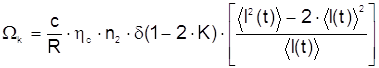 Результат подстановки: При постоянной интенсивности сигнала (непрерывный режим работы) значение в квадратных скобках выражения равно -1. Следовательно, коэффициент деления необходимо настроить и сохранять настройку с точностью K=0.5±10-4 . Для практических реализуемых допусков необходимо снова рассмотреть модуляцию но интенсивности. При «квадратной» модуляции левая часть формулы обращается в нуль, как и ожидалось. Можно ожидать подобного результата для sin2-модуляции. Однако эта форма модуляции сводит значение левой части уравнения к половинному значению для случая с постоянной интенсивностью. По-видимому, выбор формы импульса, в общем случае, должен быть согласован с рабочим циклом импульсной последовательности в целях обеспечения полной компенсации. Таким образом, упрощенный анализ показывает, что модуляция источника излучения может существенно уменьшить ошибку в измерении угловой скорости вращения ВОГ, обусловленную влиянием эффекта Керра. Выбор источника излучения ВОГ с соответствующими статистическими