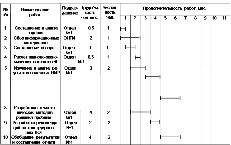 где I(t) - интенсивность излучения источника. Тогда Широкий класс источников излучения обладает статистикой, обладающей этим свойством. В частности, излучение суперлюминесцентного диода обладает статистикой, близкой к статистике поляризованного теплового источника. Излучение лазера, генерирующего в режиме большого числа аксиальных мод, с увеличением числа мод переходит в тепловую радиацию (что, впрочем, легко объяснить физически - с увеличением числа статистически независимых осцилляторов примерно одинаковой интенсивности суммарное излучение приближается к тепловому излучению). 4. Расчёт сметной калькуляции НИР. 4.1. Исходные положения. По согласованию с консультантом технико-экономического обоснование будет выполнено в виде условного расчёта сметной стоимости разработки. При проведении расчёта предполагается, что работа выполняется в научно-исследовательском институте или конструкторском бюро с привлечением специалистов своего и смежных подразделений, а дипломник выступает в качестве руководителя темы. В ходе расчёта необходимо выполнить следующие этапы: n определение трудоёмкости и календарных сроков работы; n расчёт расходов по отдельным статьям затрат и составление сметной калькуляции темы; n заключение 4.2. Определение трудоёмкости и календарных сроков работы. Планирование работы было проведено на основании ленточного графика представленного в таблице 4.1. Для сокращения общей продолжительности выполнения НИР, работы следующие друг за другом и поручаемые разным подразделениям, проводятся одновременно или, по крайней мере, с перекрытием по срокам. Считаем, что дипломник выступает в качестве научного руководителя темы и занят ее выполнением вместе с группой сотрудников своего подразделения и привлекает по мере необходимости специалистов смежных отделов в соответствии с закреплённым за ними профилем работ. 4.3.Расчёт расходов по статьям затрат и составление сметной калькуляции