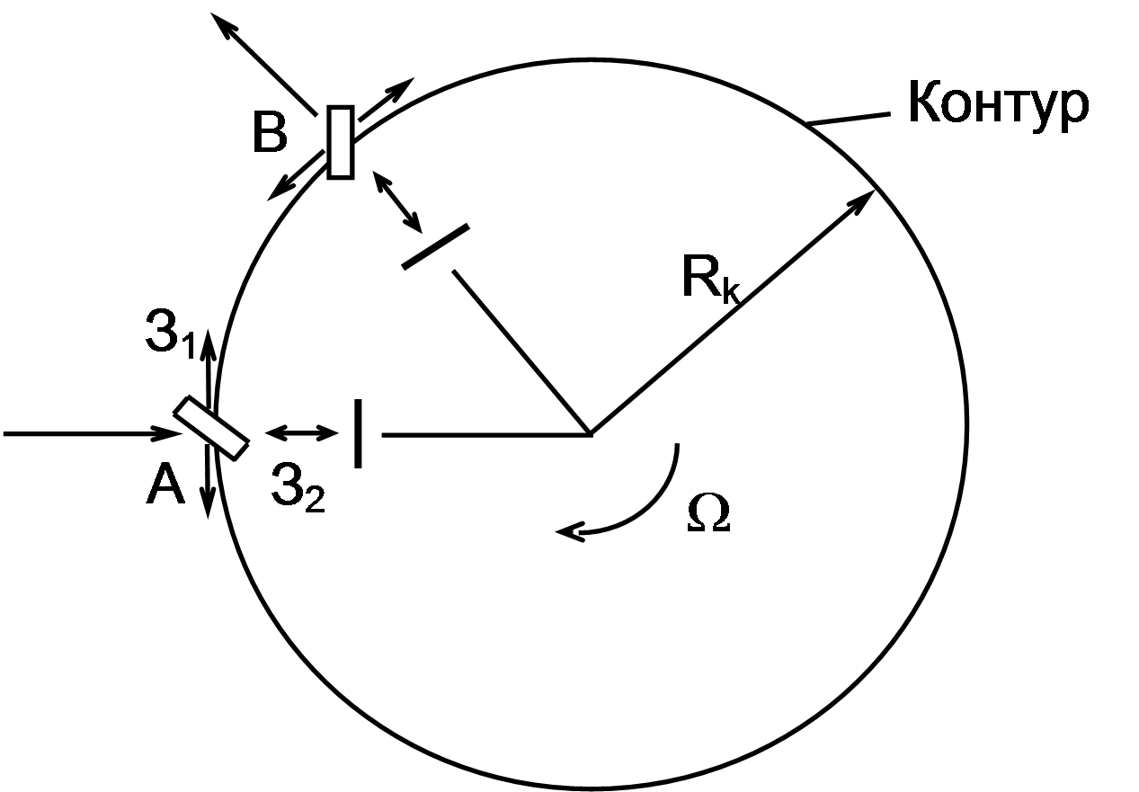 , где с - скорость света, t - время прохождения периметра контура лучом. Оба луча приходят в точку А на расщепитель в фазе. Если контур вращается с постоянной угловой скоростью W , то луч, распространяющийся по часовой стрелке, прежде чем попадет на перемещающийся расщепитель, пройдет путь Это вызвано тем, что за время прохождения луча по замкнутому контуру расщепитель, находившийся ранее в точке А, уйдет в точку В. Для луча, распространяющегося против часовой стрелки, путь Как