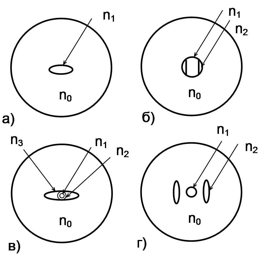 Структуры одномодовых световодов с устойчивой поляризацией: а - волокно с эллиптическим сердечником; б - волокно с боковым ячеечным распределением показателя преломления; в - волокно с эллиптической внешней оболочкой;