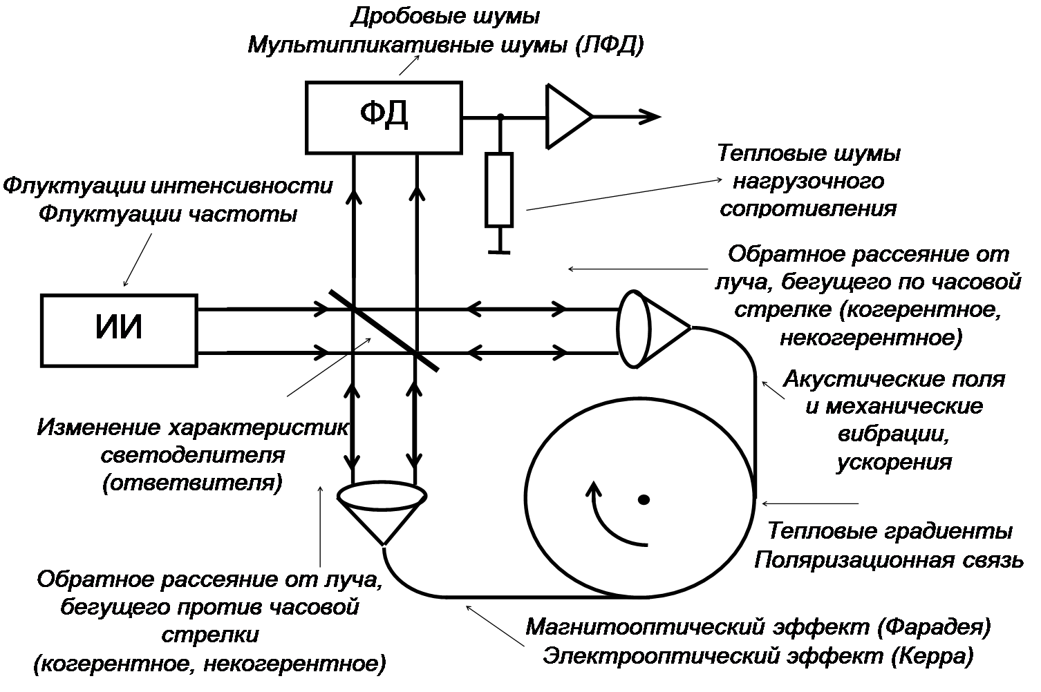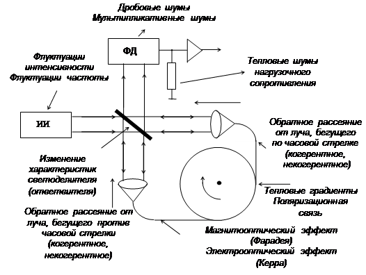 девиации 1.3. Модель шумов и нестабильностей в ВОГ. Волоконный оптический гироскоп представляет собой достаточно сложную оптико-электронную систему. При конструировании реального прибора оптические элементы и электронные устройства должны выбираться и компоноваться так, чтобы минимизировать влияние внешних возмущений (температурных градиентов, механических и акустических вибраций, магнитных полей и др.). В самом приборе, кроме того, имеет место ряд внутренних источников шумов и нестабильностей. Условно эти шумы и нестабильности можно разделить на быстрые и медленные возмущения. Быстрые возмущения оказывают случайное кратковременное усредненное влияние (секунды) на чувствительность ВОГ; они отчетливо проявляются при нулевой скорости вращения (кратковременный шум). Медленные возмущения вызывают медленный дрейф сигнала, приводящий к долговременным уходам в считывании показаний ВОГ (долговременный дрейф). Обобщенная модель источников шумов и нестабильностей в ВОГ показана на рис. 1.6.