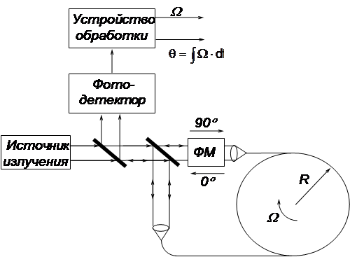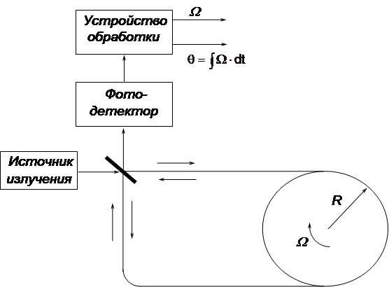 Рис 1.3. Принципиальная схема волоконно-оптического гироскопа. Если контур ВОГ образовать нитью оптического волокна длиной L, намотанного на цилиндр радиуса R, то фаза Саньяка где R - радиус витка контура; N - число витков; S -площадь витка контура. В соответствии с рис. 1.3., излучение источника подается на светоделитель и разделяется на два луча. Два луча, обошедшие контур в противоположных направлениях, рекомбинируют на светоделителе и смешиваются в фотодетекторе. Результирующее колебание можно записать в виде