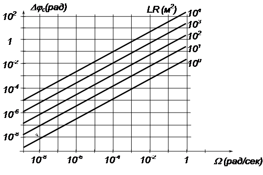 Рис 1.4. Фаза Саньяка в угловой скорости вращения для различных значений параметра LR. Работа при смещении фазы в 90° максимизирует чувствительность, однако это вносит некоторую невзаимность для двух направлений распространения лучей в гироскопе, т. к. фаза луча, распространяющегося по часовой стрелке, отличается от фазы луча, распространяющегося против часовой стрелки, в отсутствии вращения. Свойство взаимности - это второй важный момент в ВОГ. Фазовая невзаимность в ВОГ определяется дифференциальной разностью фаз встречно бегущих лучей. Любая фазовая невзаимность (разность фаз) для двух направлений дает изменения в показаниях гироскопа. Если невзаимность является функцией времени, то имеет место некоторый временной дрейф в показаниях гироскопа. Волокно длиной 500 м дает фазовую задержку порядка 1010 рад. Таким образом, для того чтобы зарегистрировать скорость вращения 0,05 град/ч, нужно, чтобы пути распространения противоположно бегущих лучей согласовывались с относительной точностью до 10-17 рад. Следует, кроме того, отметить, что сам принцип действия волоконного оптического гироскопа основан на невзаимном свойстве распространения встречных волн во вращающейся системе отсчета (появление разности фазовых набегов двух лучей при вращении). Поэтому несомненна важность анализа невзаимных эффектов и устройств в ВОГ (по меньшей мере, хотя бы для определения точности прибора). Принцип