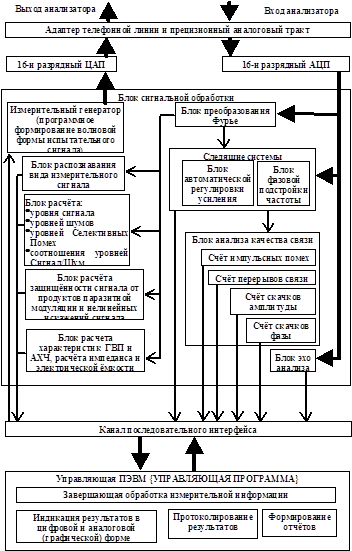 Анализатор объединяет в себе измерительно-анализирующее устройство и генератор нормированных электрических испытательных воздействий. По характеру представления измерительной информации анализатор является регистрирующим измерительным прибором и показывающим измерительным прибором с представлением на экране компьютерного дисплея измерительной информации в цифровой и аналоговой (графической) форме. Основными составными частями анализатора являются генераторный и измерительно‑анализирующий блоки. Генераторный блок при анализе каналов связи задает волновую форму сигнала программным путем и обеспечивает следующие режимы генерации: · режим генерации постоянного по частоте гармонического сигнала с постоянным или изменяющимся по линейному закону уровнем мощности - для измерений амплитудных характеристик канала связи, затухания сигнала, отношения уровней сигнала и шума (Сигнал/Шум), в том числе по Рекомендации МСЭ‑Т О.132, коэффициентов нелинейных искажений, измерения частоты и изменения частоты в канале связи, дрожания фазы, дрожания амплитуды, затухания продуктов паразитной модуляции, подсчета числа перерывов связи, подсчета числа импульсных помех, подсчета числа скачков фазы и подсчета числа скачков амплитуды; · режим генерации гармонического сигнала с изменяющейся по линейному закону частотой - для почастотного измерения АЧХ; · режим генерации многочастотного сигнала - МЧС‑генератор - для измерений относительного группового времени прохождения (ГВП), относительной амплитудно-частотной характеристики (АЧХ) и импеданса канала связи; · режим генерации псевдослучайного сигнала для измерений соотношения уровней Сигнал/Шум (шумы квантования) · режим генерации четырехчастотного сигнала для измерений нелинейных искажений · режим генерации радиоимпульсов для измерения эхо-сигнала; · режим генерации двухчастотного сигнала измерительной и эталонной частот для определения амплитудно‑частотной характеристики и частотной характеристики группового времени прохождения. В каждом режиме генерации номинальные уровни мощности испытательных сигналов и номинальные значения частот гармонических испытательных сигналов задаются дискретно. Измерительно-анализирующий блок обеспечивает мониторинг (измерение и протоколирование) тестируемых каналов связи с использованием собственного или внешнего генератора испытательных сигналов. При этом в зависимости от автоматически определяемого вида входного сигнала анализатор автоматически включает измерение тех параметров, для измерения которых и предназначен соответствующий измерительный сигнал. Измерительно-анализирующий блок как средство измерений с нормированными метрологическими характеристиками проводит определение следующих параметров и характеристик: · уровня мощности сигнала; · частоты гармонического сигнала; · уровня не взвешенного шума; · уровня псофометрического шума; · отношения уровней мощности псевдослучайного сигнала и не взвешенного шума; · соотношения уровней гармонического сигнала и псофометрически взвешенного шума, а также соотношения уровней гармонического сигнала и не взвешенного шума; · дрожания фазы гармонического сигнала; · дрожания амплитуды гармонического сигнала; · частотных характеристик ГВП и АЧХ; · уровня селективны