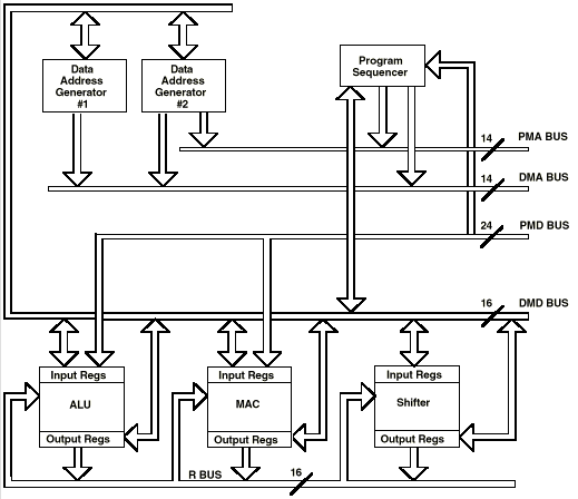 Как уже говорилось выше каждый процессор содержит три независимых вычислительных модуля: - арифметико-логический (ALU); - умножение с накоплением (MAC); - расширитель (shiffter). Эти устройства работают с 16-разрядными данными и обеспечивают аппаратную поддержку мультиточности. ALU выполняет ряд стандартных арифметических и логических команд в дополнение к примитивам деления. MAC выполняет одно-цикловые операции умножения, умножения/сложения, умножения/вычитания. Shiffter осуществляет логические и арифметические сдвиги, нормализацию, де нормализацию и операцию получения порядка, атак же управление форматом данных, разрешая работу с плавающей точкой. Вычислительные модули размещаются последовательно друг за другом, таким образом чтобы выход одного мог стать входом другого в следующем цикле. Результаты работы модулей собираются на 16-разрядную R-шину. Все три модуля содержат входные и выходные регистры, которые доступны через 16-разрядную DMD-шину. Команда, выполняемые в модулях, берут в качестве операндов данные находящиеся в регистрах ввода и после выполнения записывают результат в регистры вывода. Регистры являются как бы промежуточным хранилищем между памятью и вычислительной схемой. R-шина позволяет результату одного вычисления стать операндом к другой операции. Это позволяет сэкономить время обходясь без лишних пересылок модуль-память. Генераторы адресов данных и программа sequencerДва специализированных генератора адресов данных (DAGs) и мощная программа sequencer гарантируют эффективное использование вычислительных модулей. DAGs обеспечивают адреса памяти, когда необходимо поместить данные из памяти в регистры ввода вычислительных модулей, либо сохранить в результат из выхоных регистров. Каждый DAG отвечает за четыре указателя адреса. Если указатель используется для косвенной адресации то измениятся значение некоторого регистра. С двумя генераторами процессор может выдавать два адреса одновременно для выборки из памяти двух операндов. Для автоматической адресации модуля круговых буферов значение длины операнда может быть связано с каждым указателем. (Круговая буферная особенность также используется последовательными портами для автоматической передачи данных). DAG1 обеспечивает адреса только для данных, DAG2 – для данных и программ. Когда в регистре состояния (MSTAT) установлен соответствующий бит режима, адрес вывода DAG1 прежде чем попасть на шину адреса инвертируется. Эта особенность облегчает работу в двоичной системе. Программа Sequenсer обеспечивает последовательность команд и адресацию памяти программы. Sequencer управляется регистром команд, который указывает на команду, которая в данный момент выполняется. Выбранные команды записываются в регистр команд за один такт процессора и выполняются в течении следующего. Чтобы уменьшить количество циклов, sequencer поддерживает работу с условными переходами. ШиныПроцессоры семейства имеют пять внутренних шин. Шины адреса программы (PMA) и адреса данных (DMA) связаны с адресами памяти данных и программы. Шина данных программы (PMD) и шина данных (DMD) используются для передачи информации связанной с областями памяти. Шины мультиплексированы в одну внешнюю шину адреса и одну внешнюю шину данных. R-шина предназначена для передачи промежуточных результатов непосредственно между вычислительными мод