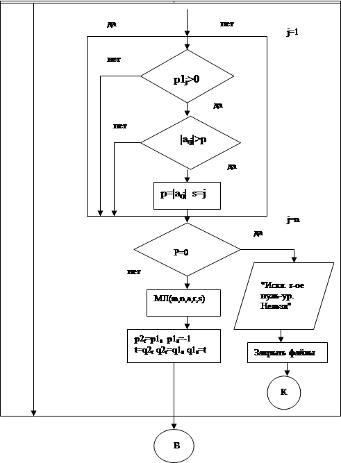 В итоге успешной работы алгоритма все нуль-уравнения будут исключены, и в отслеживающем векторе p1 это будет отмечено как -1, что даст возможность в дальнейшем соответствующие столбцы матрицы А при выборе разрешающего элемента не трогать. Если же алгоритм применить нельзя, то будет выдано сообщение (см. блок-схему), и работа программы закончится. 7.2 Листинг модуля, исходных данных и результатов машинного расчета. unit isnum; interface uses typesm,mjim; procedure isnu(var k1:k1t;m,n:integer; var a:at; var p1,q1:vec1it; var p2,q2:vec2it); implementation procedure isnu; var p:real;k,s,r,j,t:integer; begin for r:=1 to k do begin if p2[r]<0 then p1[abs(p2[r])]:=-1;end; p:=0; for j:=1 to n do begin if p1[j]>0 then begin if abs(a[r,j])>p then begin p:=abs(a[r,j]);s:=j;end; end;end; if p=0 then begin writeln(fo,'Исключить r',r:6,'-ое нуль-уравнение нельзя'); close(fi);close(fo);halt end; mji(m,n,a,r,s); p2[r]:=p1[s];p1[s]:=-1; t:=q2[r];q2[r]:=q1[s];q1[s]:=t; end; end. Исходный файл simp.dat: 12 Исключение нуль-уравнений Моносов ЭОУС-1-2 преподаватель Марьямов А. Г. 12.05.98 2 2 0 5 3 -2 -1 1 -2 1 -1 0 -1 -1 -1 0 -2 0 1 0 2 2 1 0 4 4 4 0 0 1 2