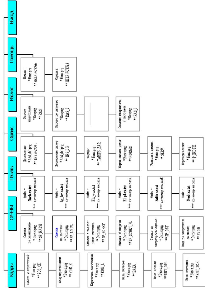 В приложении используются семь внешних процедур. т.е. 7 файлов типа .PRG из них один процедурный. Краткая характеристик каждого из них: MENU.PRG-главный программный файл (приложение 1.1) FUNC.PRG-процедурный файл (приложение 1.2) OPEN.PRG-файл открытия БД (приложение 1.3) BAZES.PRG-файл BROWSE-окон (приложение 1.4) ADD_DEL.PRG-файл дополнение и изменения данных (приложение 1.5) RAS.PRG-файл расчетов квартплаты, льгот и их слияния (приложение 1.6) OTCHET.PRG-файл формирование отчетов (приложение 1.7) При старте программы запускается главный файл, т.е. файл MENU.PRG, который будет запускать работу всей информационной системы, он состоит из следующих блоков: Блок установочных команд SET определяющих параметры конфигурации рабочей среды; Открытие баз данных и необходимых индексных файлов; Определение глобальных переменных, массивов и их инициализация; Определение и описание окон; Описание и активизация работы главного меню для выбора основных вариантов работы системы и передача управления соответствующим программным файлам или подпрограммам; Закрытие баз данных и выход из СУБД. Сейчас рассмотрим работу приложения в той последовательности, как она выполняется по шаговом выполнении каждого кода в окне трассировки. Для чего, при чтении данной главы целеобразно запустить среду FoxPro, открыть в окне трассировки файл MENU.PRG в режиме пошагового выполнения, либо обращаться к приложению 1, где прилагаются распечатки файлов программ В первых строках файла MENU.PRG с помощью команд SET устанавливается операционная среда: Отключение макросов Установление даты Запрет отображения на экране записей помеченных на удаление Отключение статус-строки и т.д. Далее определяются и загружаются в память цветовые схемы, которые используются для раскраски окон и некоторых областей внутри них.(SET COLOR OF SCHEME). Подключается процедурный файл (FUNC.PRG), командой ON ERROR и функцией ERROR() определяется анализ возможных ошибок в программе. Далее вызывается процедура находящаяся в файле OPEN.PRG (см. прилож. 1.3 стр. 1) для открытия БД. Здесь проверяется наличие баз на диске и если их нет, то они создаются с помощью языка SQL, при этом в БД HELP, которая состоит из одного MEMO-поля, копируются текстовые файлы помощи. Если базы уже созданы ранее, то они открываются в заданных областях вместе со структурными индексами, которые содержат TAG’и для связи БД и систематизированного предъявления данных: БД <RABOT.DBF> (База жильцов) TAG-tab – индексирование по полю табельного номера, для связи с БД ставок (TABLE_R.DBF). TAG-fam – индексирование по полю фамилии, для поиска командой SEEK. TAG-n_lg – индексирование по полю номера льготы (код), для связи с БД льгот (LGOT.DBF). TAG-date – индексирование по полям периода действия льготы (dat_c,dat_po), для расчета сумм по льготникам, рассчитываются только те льготники, у кого период входит в текущую дату и кто не имеет периода действия льготы. TAG-lgt – индексирование по полям адреса, с условием, что предъявляться будут только жильцы, имеющие льготу. TAG-ord – индексирование по полям адреса, с условием, что предъявляться будут только те жильцы, кто платит за квартиру. TAG-adrr – индексирование по полям адреса и табельного номера, для связи с БД начислений (OPLATA.DBF), а также это главный TAG при просмотре данных. БД <OPLATA.DBF (База начислений) TAG-tab –индексирование по полю табельного номера. TAG-adr – индексирование по адресу, для связи с БД жильцов (RABOT.DBF) БД <LGOT> (БД льгот) TAG-n