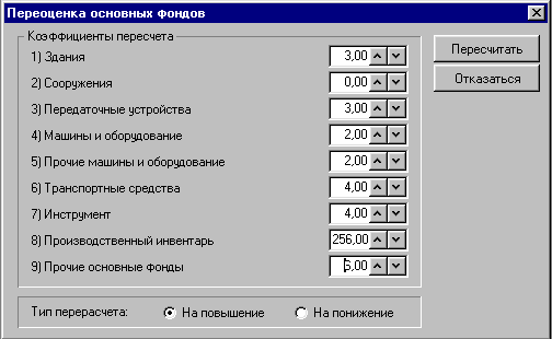 Для переоценки оборудования необходимо точно указать коэффициенты перерасчета для каждого типа оборудования (Здания, сооружения, автотранспорт и т.д.). В случае если основные фонды морально устарели и не имеют прежней стоимости, тогда нанимается оценщик оборудования, и по его заключению производят перерасчет балансовой стоимости оборудования. Вариант реализации расчетов на языке Object Pascal: DataModule1.Table1.Active:=False; DataModule1.Table13.First; While not DataModule1.Table13.Eof Do DataModule1.Table13.Delete; IF RadioButton1.Checked=True Then Begin DataModule1.Table6.First; While not DataModule1.Table6.EOF Do Begin IF DataModule1.Table6Kod.Value='1' Then Koof:=AHMRealSpinEdit1.Value; IF DataModule1.Table6Kod.Value='2' Then Koof:=AHMRealSpinEdit2.Value; IF DataModule1.Table6Kod.Value='3' Then Koof:=AHMRealSpinEdit3.Value; IF DataModule1.Table6Kod.Value='4' Then Koof:=AHMRealSpinEdit4.Value; IF DataModule1.Table6Kod.Value='5' Then Koof:=AHMRealSpinEdit5.Value; IF DataModule1.Table6Kod.Value='6' Then Koof:=AHMRealSpinEdit6.Value; IF DataModule1.Table6Kod.Value='7' Then Koof:=AHMRealSpinEdit7.Value; IF DataModule1.Table6Kod.Value='8' Then Koof:=AHMRealSpinEdit8.Value; IF DataModule1.Table6Kod.Value='9' Then Koof:=AHMRealSpinEdit9.Value; IF Koof<>0 Then Begin DataModule1.Table13.Append; DataModule1.Table6.Edit; DataModule1.Table13.FieldByName('Old_Stoim').AsFloat:=DataModule1.Table6Bas_stoim.Value; PolZnac:=DataModule1.Table6Bas_stoim.Value/100*Koof; DataModule1.Table6Bas_stoim.Value:=DataModule1.Table6Bas_stoim.Value+PolZnac; DataModule1.Table13.FieldByName('New_Stoim').AsFloat:=DataModule1.Table6Bas_stoim.Value; DataModule1.Table13.FieldByName('Inventar').AsString:=DataModule1.Table6Inventar.Value; DataModule1.Table13.FieldByName('Uhastoc').AsString:=DataModule1.Table6Uhastoc.Value; DataModule1.Table13.FieldByName('DataRash').AsDateTime:=Date; DataModule1.Table13.Post; DataModule1.Table6.Post; End; DataModule1.Table6.Next; End; DataModule1.Table9.First; While not DataModule1.Table9.EOF Do Begin IF DataModule1.Table9Kod.Value='1' Then Koof:=AHMRealSpinEdit1.Value; IF DataModule1.Table9Kod.Value='2' Then Koof:=AHMRealSpinEdit2.Value; IF DataModule1.Table9Kod.Value='3' Then Koof:=AHMRealSpinEdit3.Value; IF DataModule1.Table9Kod.Value='4' Then Koof:=AHMRealSpinEdit4.Value; IF DataModule1.Table9Kod.Value='5' Then Koof:=AHMRealSpinEdit5.Value; IF DataModule1.Table9Kod.Value='6' Then Koof:=AHMRealSpinEdit6.Value; IF DataModule1.Table9Kod.Value='7' Then Koof:=AHMRealSpinEdit7.Value; IF DataModule1.Table9Kod.Value='8' Then Koof:=AHMRealSpinEdit8.Value; IF DataModule1.Table9Kod.Value='9' Then Koof:=AHMRealSpinEdit9.Value; IF Koof<>0 Then Begin DataModule1.Table13.Append; DataModule1.Table9.Edit; DataModule1.Table13.FieldByName('Old_Stoim').AsFloat:=DataModule1.Table9Bal_stoim.Value; PolZnac:=DataModule1.Table9Bal_stoim.Value/100*Koof; DataModule1.Table9Bal_stoim.Value:=DataModule1.Table9Bal_stoim.Value+PolZnac; DataModule1.Table13.FieldByName('New_Stoim').AsFloat:=DataModule1.Table9Bal_stoim.Value; DataModule1.Table13.FieldByName('Inventar').AsString:=DataModule1.Table9Inventar.Value; DataModule1.Table13.FieldByName('Uhastoc').AsString:=DataModule1.Table9Uhastoc.Value; DataModule1.Table13.FieldByName('DataRash').AsDateTime:=Date; DataModule1.Table13.Post; DataModule1.Table9.Post; End; DataModule1.Table9.Next; End; End; IF RadioButton2.Checked=True Then Begin DataModule1.Table6.First; While not DataModule1.Table6.EOF Do Begin IF DataModule1.Table6Kod.Value='1' Then Koof:=AHMRealSpinEdit1.Value; IF DataModule1.Table6Kod.Value='2' Then Koof:=AHMRealSpinEdit2.Value; IF DataModule1.Table6Kod.Value='3' Then Koof:=AHMRealSpinEdit3.Value; IF DataModule1.Table6Kod.Value='4' Then Koof:=AHMRealSpinEdit4.Value; IF DataModule1.Table6Kod.Value='5' Then Koof:=AHMRealSpinEdit5.Value; IF DataModule1.Table6Kod.Value='6' Then Koof:=AHMRealSpinEdit6.Value; IF DataModule1.Table6Kod.Value='7' Then Koof:=AHMRealSpinEdit7.Value; IF DataModule1.Table6Kod.Value='8' Then Koof:=AHMRealSpinEdit8.Value; IF DataModule1.Table6Kod.Value='9' Then Koof:=AHMRealSpinEdit9.Value; IF Koof<>0 Then Begin DataModule1.Table13.FieldByName('Old_Stoim').AsFloat:=DataModule1.Table6Bas_stoim.Value; DataModule1.Table6.Edit; PolZnac:=DataModule1.Table6Bas_stoim.Value/100*Koof; DataModule1.Table6Bas_stoim.Value:=DataModule1.Table6Bas_stoim.Value-PolZnac; DataModule1.Table13.FieldByName('New_Stoim').AsFloat:=DataModule1.Table6Bas_stoim.Value; DataModule1.Table13.FieldByName('Inventar').AsString:=DataModule1.Table6Inventar.Value; DataModule1.Table13.FieldByName('Uhastoc').AsString:=DataModule1.Table6Uhastoc.Value; DataModule1.Table13.FieldByName('DataRash').AsDateTime:=Date; DataModule1.Table13.Post; DataModule1.Table6.Post; End; DataModule1.Table6.Next; End; DataModule1.Table9.First; While not DataModule1.Table9.EOF Do Begin IF DataModule1.Table9Kod.Value='1' Then Koof:=AHMRealSpinEdit1.Value; IF DataModule1.Table9Kod.Value='2' Then Koof:=AHMRealSpinEdit2.Value; IF DataModule1.Table9Kod.Value='3' Then Koof:=AHMRealSpinEdit3.Value; IF DataModule1.Table9Kod.Value='4' Then Koof:=AHMRealSpinEdit4.Value; IF DataModule1.Table9Kod.Value='5' Then Koof:=AHMRealSpinEdit5.Value; IF DataModule1.Table9Kod.Value='6' Then Koof:=AHMRealSpinEdit6.Value; IF DataModule1.Table9Kod.Value='7' Then Koof:=AHMRealSpinEdit7.Value; IF DataModule1.Table9Kod.Value='8' Then Koof:=AHMRealSpinEdit8.Value; IF DataModule1.Table9Kod.Value='9' Then Koof:=AHMRealSpinEdit9.Value; IF Koof<>0 Then Begin DataModule1.Table13.FieldByName('Old_Stoim').AsFloat:=DataModule1.Table9Bal_stoim.Value; DataModule1.Table9.Edit; PolZnac:=DataModule1.Table9Bal_stoim.Value/100*Ko