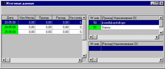 Имя таблицы: Rashod.DB (тип: Borland Paradox). Назначение: Данная таблица является основной для хранения информации по расходу основных средств за текущий месяц (Таблица 19.3), что позволяет работать с списком расходованного оборудования до окончания месяца. В данную таблицу попадают данные из основной таблицы (полный перенос данных, что исключает дублирование данных), что позволяет произвести откат, ошибочно сделанного расхода оборудования. В таблицу входят поля (Инвентарный номер, наименование, шифр амортизации, балансовая стоимость, остаточная стоимость, месячная амортизация, подразделение, подотчетное лицо и тп.). (подробнее о структуре в приложении 1). Таблица 19.3 - Структура таблицы Rashod.DB