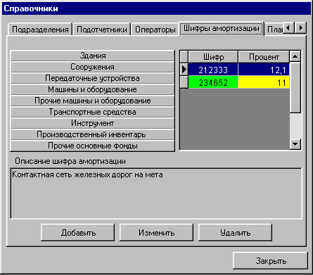 В данном окне вы сможете добавить, изменить и удалить шифр амортизации, который можно найти в справочниках по расчету амортизационных отчислений. Нажав на кнопке «Добавить» появится окно, в котором необходимо ввести (шифры амортизации, описание и группу шифров по типу). Если необходимо изменить данные по подразделению нажмите кнопку «Изменить» и появится окно аналогичное процедуре |
