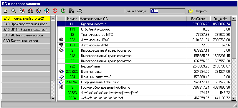 Работа с основным списком подразумевает текущую работу бухгалтерии по оборудованию находящемуся на балансе предприятия. Это такие функции как расходование оборудования, расходование в лизинговую компанию, перемещение оборудования между организациями субподрядчиками, ввод данных о пробеге автотранспортных средств за месяц, расщепление оборудования на составные части, просмотр текущего состояния и т.д. Для запуска, выберите пункт меню «Просмотр - ОС в подразделениях» и появится окно (рисунок 21.6).