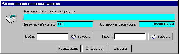 Расход основных средств - данная процедура предназначена для расхода основных средств с баланса предприятия, для этого нажмите на кнопке «Расход» и появится окно (рисунок 21.7), в котором введите номера счетов и нажмите «расходовать»