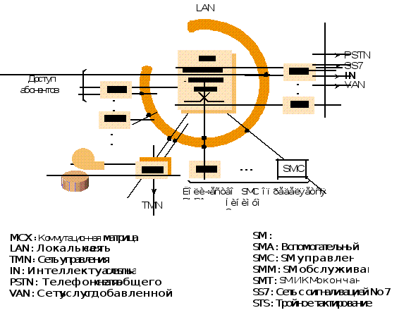 dF/F < 5 х 10-7 ожидание 72 ч. В синхронном режиме база времени принимает внешние сигналы хронирования посредством таймера интерфейса синхронизации. Применяется режим синхронизации ведущий/ведомый. Таймер интерфейса синхронизации принимает сигналы синхронизации от одной или нескольких SMT-станций на максимум четырех портах. Он выбирает готовую линию связи с наивысшим приоритетом. Один или несколько портов хронирования могут быть автоматически изъяты из эксплуатации или возвращены в нее (например, при обнаружении ИКМ-аварийных сигналов, передаваемых SMT-станцией). Интерфейсы синхронизации отфильтровывают все возмущения на линиях синхронизации. Такая организация гарантирует точность и стабильность в соответствии с Рекомендацией G.811 ITU-Т, независимо от возмущений в линии синхронизации и ее состояний. Станция синхронизации и временной базы также распределяет сигналы хронирования на другие станции в АТС. Она передает 8 МГц сигнал и 8 МГц сигнал синхронизации кадров на каждую ветвь центральной коммутационной матрицы. Эти два сигнала утраиваются и принимаются коммутирующей МП-станцией, которая выбирает одну совокупность сигналов обработкой логики большинства и распределяет их на центральную коммутационную матрицу и ILR-интерфейсы. Связи между МП-станцией ИКМ-окончания (SMT) и таймером интерфейса синхронизации ограничены расстоянием 50 м, а связи между временной базой и центральной коммутационной матрицей - расстоянием 25 м. Это допускает значительную гибкость в выборе мест расположения станций. 4.3.7 ЛОКАЛЬНАЯ СЕТЬ (LAN)Локальная межпроцессорная сеть связи представляет собой сетевую структуру, содержащую межпроцессорную шину (MIS) для пересылки сообщений между SMC-станциями и SMM-станцией, а также шину станционного доступа (MAS) для пересылки сообщений между станциями SMA, SMT и SMX и станциями SMC. Сообщения пересылаются в единой среде с использованием уникального протокола передачи данных. Этой средой является кольцевая сеть с эстафетным доступом (token ring), работающая в соответствии со стандартом 802.5 ИИЭР (применимым к кольцевым топологиям, использующим метод эстафетного доступа). Это означает, что к одному и тому же кольцу может быть подсоединено множество станций или процессоров, что обеспечивает следующие преимущества :