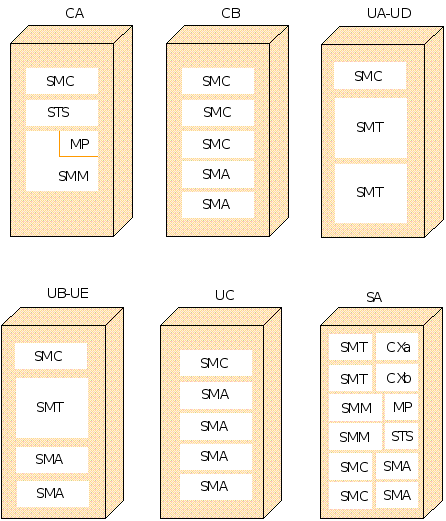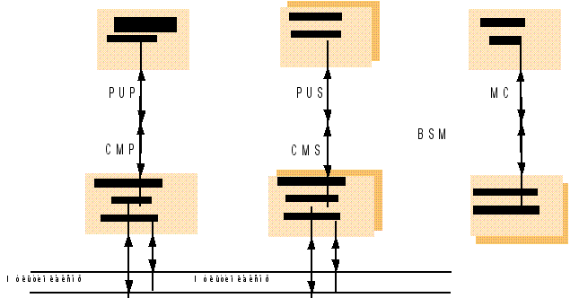 Рис.14. Архитектура МП-станции. 4.3.2 ФУНКЦИИ МП-СТАНЦИИМП-станции выполняют функции управления, причем каждая из них реализуется программным модулем или программной машиной. Каждая программная машина содержит набор программ, называемых "блоком обмена" (ЕСН). Программные машины обработки вызовов и тарификации содержат второй набор программ, представляющий собой программы обработки вызовов (ТАР) и программы тарификации (ТАХ). Программы блока обмена всегда загружены в первичный процессор МП-станции (PUP). 4.3.2.1 ФУНКЦИЯ ОБРАБОТКИ ВЫЗОВОВВ дополнение к ПО блока обмена, встроенному в главный процессор (PUP), программная машина обработки вызовов содержит программы обработки вызовов (ТАР). МП-станция управления (SMC) может иметь до четырех вторичных процессоров (PUS), причем каждый из них загружен ТАР-программами посредством некоторой программы упорядочения, управляющей контекстами вызовов. Конфигурация вторичного процессора, реализующая эту функцию, зависит от потребностей трафика и конкретных требований к качеству обслуживания. 4.3.2.2 ФУНКЦИЯ ТАРИФИКАЦИИМП-станция управления (SMC) может иметь четыре вторичных процессора (PUS), загруженных программами тарификации, причем каждый из них использует некоторую программу упорядочения для управления контекстами тарификации. Конфигурация вторичного процессора зависит от потребностей трафика и конкретных требований к качеству обслуживания. 4.3.2.3 ФУНКЦИЯ OA&MФункция OA&M поддерживается МП-станцией техобслуживания (SMM), которая является полностью дублированной для обеспечения работы в активном / резервном режиме. Она выполняет функции инициализации системы, центральной защиты, безопасности данных и OA&M. SMM может быть подключена к центру управления сетью (NMC). Она состоит из двух полустанций, каждая из которых содержит (см. рис.15) :