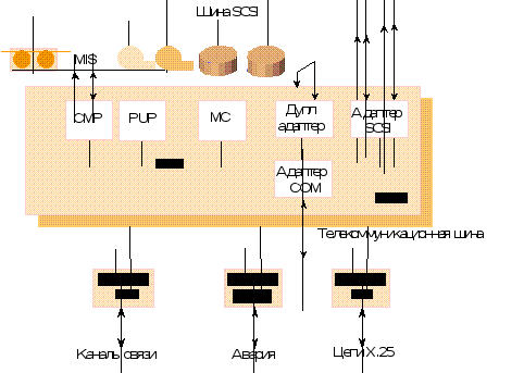 МП-станция, таким образом, содержит совокупность базового оборудования, к которому может быть подключено дополнительное оборудование (см. рис.14). Ядро системы включает BSM-шину, первичный процессор и драйвер шины первичного мультиплексирования. В соответствии с требуемыми функциями добавляется дополнительное оборудование: вторичные процессоры (PUS), драйверы шин вторичного мультиплексирования, выделенные драйверы линий и т.п. 4.3.1.1 BSM-ШИНАЭто - главная шина МП-станции, поддерживающая процессоры, платы памяти и драйверы линий. BSM-шина каждой МП-станции поддерживает до 32 плат соединительных линий. 4.3.1.2 ПРОЦЕССОРКаждый процессор содержит следующие ресурсы :