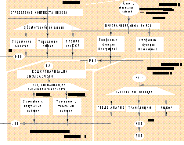 Все ИКМ-тракты (каким бы ни было их использование) подсоединяются к MП-станции ИКМ-окончания (SMT), которая, при необходимости, выполняет предварительную обработку сигнализации по выделенному каналу и обеспечивает интерфейс с центральной коммутационной матрицей. В случае линий связи 64 кбит/с, полупостоянные соединения устанавливаются в SMT и центральной коммутационной матрице, расширяя уровень 1 системы сигнализации №7 ITU-T до MП-станции обработки сигнализации (SMA), которая, в частности, обрабатывает уровень 2. SMA содержит сервисные блоки (тональные генераторы и генераторы многочастотных сигналов, частотные приемники, каналы конференц-связи и т.п.) и интерфейс с центральной коммутационной матрицей. Дополнительный сервисный блок сортирует внутренние и внешние аварийные сигналы АТС, которые обрабатываются MП-станцией местного техобслуживания (SMM). Синхросигналы, требующиеся для функционирования системы Alcatel 1000 E10, вырабатываются MП-станцией синхронизации и базы времени (STS), которая либо работает независимо, либо управляется внешним тактовым генератором, который трижды дублируется в STS. Эксплуатация и техобслуживание (OA&M) MП-станция местного техобслуживания (SMM) полностью дублирована и выполняет OA&M для нормального функционирования АТС и загрузки ПО. Она управляет всеми техническими и программными средствами, процедурами инициализации, реконфигурации системы (при необходимости) и обеспечивает резервные копии для программ и данных. Она также выполняет функции локального мониторинга и отображения аварийной сигнализации и используется для местного администрирования, основанного на стандартных или интеллектуальных терминалах. Она использует TMN-интерфейс Q.3, удовлетворяющий Рекомендациям ITU-Т для централизованного OA&M. 4.2 ФУНКЦИОНАЛЬНОЕ ОПИСАНИЕОсновными функциями управления являются : обработка вызовов, трансляция, тарификация, обработка общей канальной сигнализации и распределение сообщений. ОСВ283 управляет также коммутацией, подключением ИКМ-систем и реализует управление сервисными блоками. 4.2.1 ФУНКЦИИ ОБРАБОТКИ ВЫЗОВОВК функции обработки вызовов применяется избыточность n+1, причем n определяется в соответствии с условиями нагрузки и указанным качеством обслуживания. Вызовы устанавливаются и сбрасываются путем выделения областей памяти (или "контекстов вызова"). Обработка вызовов включает :