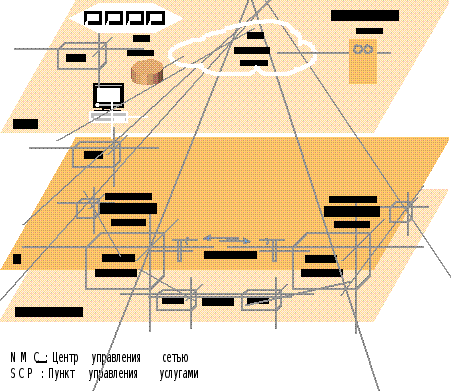 Рис.1. Окружение системы Alcatel 1000 E10. 1.2 ALCATEL 1000 E10 В СЕТЕВОМ ОКРУЖЕНИИAlcatel 1000 E10 вбирает в себя функциональные возможности интеллектуальной сети (IN), сети мобильной радиосвязи и Сети Управления Телекоммуникациями (TMN), благодаря чему способствует внедрению общей канальной сигнализации ОКС N7 с функцией транзитного пункта сигнализации (STP). Интеллектуальная сеть Интеллектуальная сеть (IN) представляет собой новую концепцию сети связи. Интеллектуальные системы обрабатывают весь спектр сетевых услуг, распределеных по выделеным узлам, называемым пунктами управления услугами (SCP). IN предлагает :