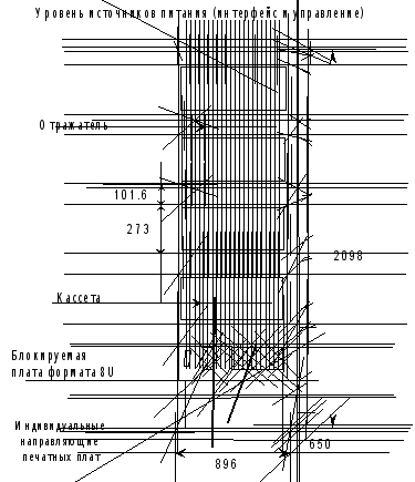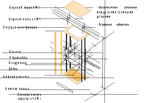 Рис.24. Структура статива. Все возможные источники утечки излучения в чувствительных точках (дверцы, вентиляционные решетки, кабельные входы) устранены. Особое внимание уделено отфильтровыванию помех на кабельных входах и заземлению накапливающихся зарядов путем экранирования кабелей внешних связей (питание, ИКМ-тракты, абонентские линии).