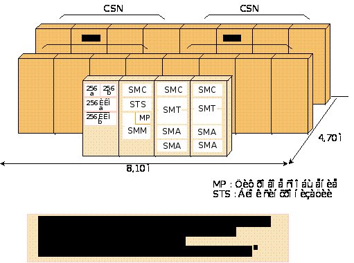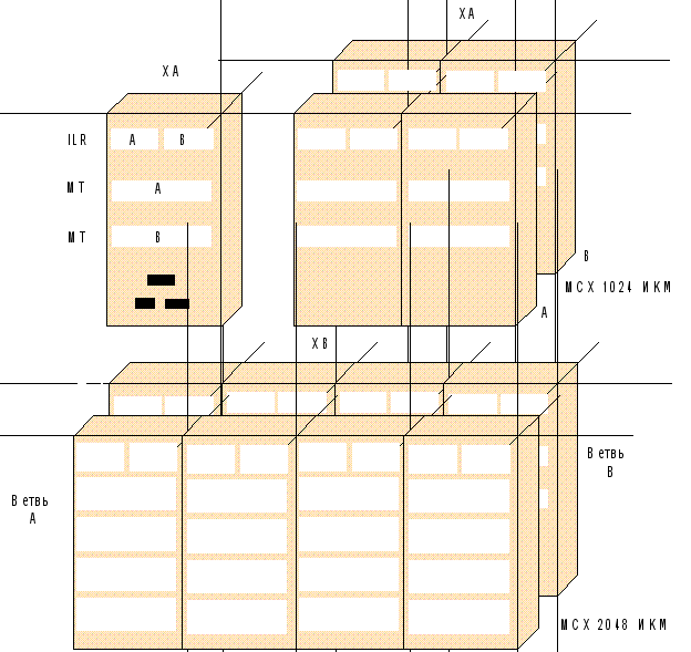Рис.16. Квадратная коммутационная матрица : ILR-интерфейсы LRE-линии подсоединяются к ILR-интерфейсам, которые передают закодированные выборки на квадратную матрицу и принимают выборки с этой матрицы для передачи по LRS-линиям. ILR также использует три контрольных бита и биты активации тестов и распределяет сигналы хронирования. МСХ-управление Функции управления подсистемы коммутации выполняются программной машиной СОМ, поддерживаемой МП-станциями коммутации (SMX). Каждый модуль коммутации (2048 LRE x 256 LRS) требует выделения SMX-станции, что дает в результате максимум восемь SMX-станций для каждой ветви. SMX-станция выполняет функции управления соответствующим модулем коммутации и обеспечивает интерфейс между этим модулем коммутации и МП-станцией управления (SMC). Она принимает команды соединения и разъединения от этих SMC-станций и посылает ответы от подсистемы коммутации. Кроме того, каждая станция принимает трижды дублированные сигналы хронирования (8 МГц и кадровая синхронизация), которые она выбирает по мажоритарному принципу и распределяет на центральную коммутационную матрицу, а также на SMT и CSN блоки доступа через ILR-интерфейсы. 4.3.5.2 ИНТЕРФЕЙСЫ ПОДСИСТЕМЫ КОММУТАЦИИПодсистема коммутации соединена с блоками доступа (CSN, SMT, SMA) по LR-линиям (LRE и LRS). Эти линии осуществляют передачу информации с темпом 4 Мбит/с (16 бит на канал) и состоят из проводных пар для расстояний до 50 м. В дальнейшем предполагается использование волоконно-оптических линий 34 Мбит/с ( мультиплексирующих восемь линий LRE или LRS ) при расстояниях до 300 м. Этот способ организации, вместе с указанной организацией распределения сигнала хронирования, обеспечивает высокую гибкость в размещении устройств доступа вокруг центральной коммутационной матрицы в машинном зале АТС. 4.3.5.3 БЕЗОПАСНОСТЬ ФУНКЦИИ КОММУТАЦИИЦентральная коммутационная матрица имеет две идентичных ветви, каждая из которых управляется группой SMX-станций. Поскольку каждое соединение устанавливается одновременно в обеих ветвях (СХа и СХb), для каждого вызова должно быть выбрано активное соединение. Эта задача решается функцией выбора ветви и усиления (SAB), которая является частью устройства доступа (SMT, SMA или CSN), подключенного к центральной коммутационной матрице.