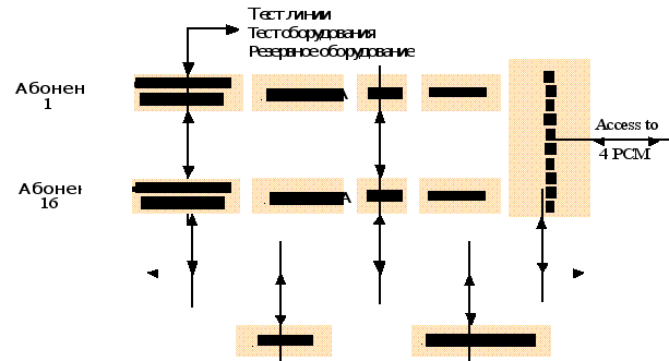 Все функции линейных блоков удовлетворяют Рекомендациям ITU-T G.703, G.704 и G.737 (интерфейсы) и I.412, I.431, I.441 и I.451 (каналы В и D). Каждая плата обеспечивает полный доступ одного абонентского комплекта 30B+D к ИКМ-трактам к ОСВ283. В цифровом концентраторе устанавливается ряд плат абонентских линий 30B+D. Емкость ограничивается только объемом трафика, подаваемого на ИКМ-тракты доступа. 3.2.4 ЦИФРОВОЙ КОНЦЕНТРАТОР Абонентский цифровой концентратор (CN) содержит до 16 аналоговых или цифровых (базовый или основной доступ) окончаний абонентских линий. Он также содержит схемы позиционирования и тестирования, ИКМ-интерфейс и схемы синхросигнала (см. рис.9). Основной функцией цифрового концентратора является концентрация канальных сигналов от этих плат (сигналы 64 кбит/с от аналоговых линий, сигналы В и D каналов от цифровых линий и т.п.) по направлению не более, чем к четырем ИКМ-трактам, соединяющим CN с цифровым устройством управления (UCN). CN использует HDLC-процедуру для связи с UCN по дублированной 64 кбит/с линии связи. Все абонентские линии, соединеные с той или иной аналоговой или цифровой платой, а также все временные интервалы с основным доступом имеют полный доступ ко всем ИКМ-канальным интервалам, соединяющим CN c UCN. Это позволяет избежать риска неравномерного распределения трафика и приводит к отсутствию каких-либо ограничений на подключения (любая плата может быть смонтирована в CN на любом месте и любой абонентский комплект на плате может быть использован для подключения любой линии). Линии, подсоединенные к CN, разделяют, таким образом, трафик, подаваемый по ИКМ-тракту от UCN, равными долями. Поскольку имеются до 4 ИКМ-трактов, вероятностью блокировки можно пренебречь. Местный (CNL) или выносной (CNE) цифровой концентратор позволяет выполнять одни и те же функции для всех подсоединенных линий. С точки зрения аппаратного обеспечения, отличаются только интерфейсные схемы UCN. 3.2.5 ЦИФРОВОЕ УСТРОЙСТВО УПРАВЛЕНИЯ Управление CSN осуществляется цифровым управляющим устройством (UCN), которое также выполняет основные коммутационные функции. Оно стыкует CSN с ОСВ283 по стандартным 2 Мбит/с ИКМ-трактам. Оно использует для взаимодействия с ОСВ283 сигнализацию №7 ITU-Т. Функции управления и коммутации выполняются главным образом двумя модулями (UCX), функционирующими в активном/резервном режиме. Каждый UCX содержит (см. рис.10) :