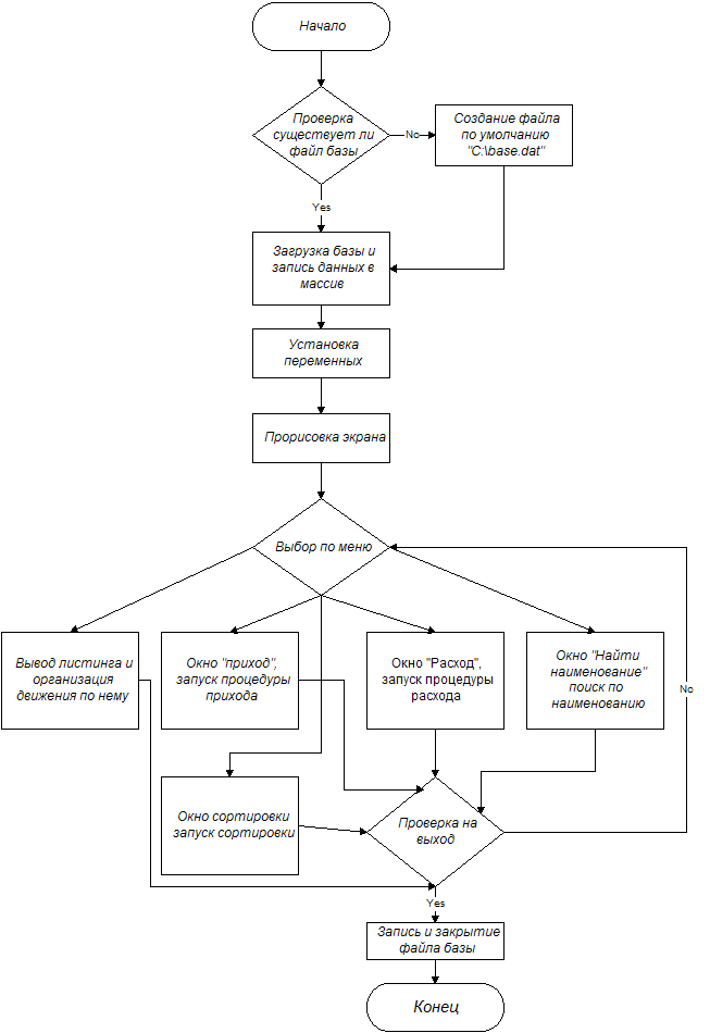 ВВедение. Данная программа автоматизированного рабочего места разработана для работников складских помещений, естественно если у них имеется компьютер классом не ниже Pentium. Сейчас на рынке программного обеспечения появляются все больше и больше различных программ для работы не только со складом, но и различные другие программные средства автоматизированного рабочего места, но стоимость их лицензионных копий доходит порой до нескольких десятков тысяч, а моя программа может быть конечно маленько еще «сыровата», но в процессе работы с нею её можно «довести ее до ума» и все это лишь за пятерку по программированию цена не велика за произведение программного искусства. Каковы её плюсы: ну это естественно простота и понятность (для русского человека) интерфейса программы, что не требует дополнительного обучения или прохождения специальных курсов, особенно для женщин, работающих на складах и не посвященных в азы компьютеров и программного обеспечения; не требовательность к системным ресурсам машины; легкость ввода и отслеживания; простота резервирования базы данных (всего 1 файл), что не маловажно для такой программы. При написании и разработке курсового проекта я научился работать с Borland Pascal, Microsoft Windows 95OSR2, Microsoft Word 97 SR-2 которые использовались для работы над курсовым проектом, научился использовать справку и другие функции Borland Pascal при этом даже разобрался с английским языком и использованием электронных словарей переводчиков таких как Promt, Stylus, Magic Gooddy 98. Огромное спасибо Волкову А.И. – за отличное преподавание предметов, Billу Gaits – за то что он умеет зарабатывать деньги собственным умом, Мерзлякову Д.С. – за поддержку в трудную минуту, Барышеву А.А. – за техническую поддержку, Русских А.И. – за программную поддержку, Казакову В.С. – за разрешение работать на компьютере, Sting, Queen, и другим за хорошую музыку во время работы над курсовым. I. Задание. Составить программу автоматического рабочего места для работы со складом. Программа должна предоставлять пользователю возможность: 1. Вводить новый товар, указывая следующие параметры ü Наименование; ü Количество; ü Цену; ü Дату поступления. 2. Осуществлять поиск товара по наименованию и выдавать его параметры. 3. Помечать выбывший товар, указывая дату выдачи. 4. Выводить список имеющегося товара с возможностью сортировки по любому параметру. 5. Выводить список выбывшего товара с возможностью сортировки по любому параметру. 6. Выдавать общую статистическую характеристику: ü Общая стоимость имеющегося товара; ü Количество имеющегося товара; ü Количество выбывшего товара. 7. Сохранять и восстанавливать всю информацию АРМ с диска. II. описание переменных и алгоритма работы программы. Описание переменных. ü basskl – основная запись с необходимыми переменными это: Ø naim – наименование товара; Ø kol – количество товара; Ø price – цена товара; Ø kol_p – количество пришедшего товара; Ø kol_r – количество товара который ушел; Ø date_p – дата прихода товара; Ø date_r – дата расхода товара. ü f – file базы слада; ü list – массив данных базы; ü schet – cчетчик; ü curs – показатель позиции; ü stran – счетчик позиции курсора; ü i – переменная использования; ü mcurs – переменная начальной позиции меню; ü k –переменная определения клавиши; ü res –переменная выбора меню; ü da – переменная использования; ü er – переменная ошибки преобразования; 