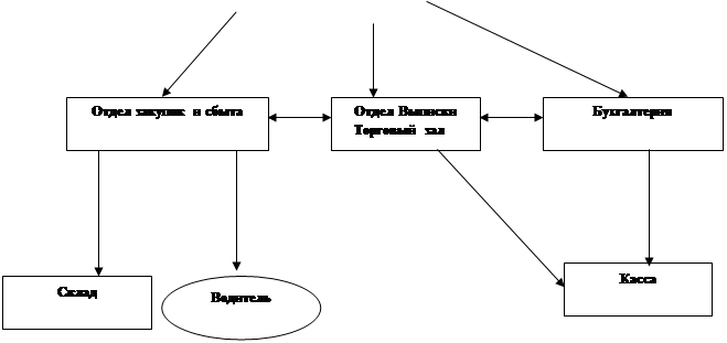 Рис. 2. Внешние и внутренние информационные связи отдела закупок и сбыта На рассматриваемом предприятии есть водитель для доставки товаров. В его обязанности входит доставка замков и инкассация средств за товар. Отношения между отдельными местами и задачами характеризуются отношениями подчиненности сверху и снизу, или отношениями по горизонтали.