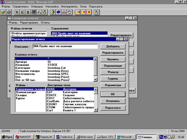 2.1.2. Характеристика нормативно-справочной и входной оперативной информации для получения новой отчетной формы «Прайс-лист по наличию» Под входной информацией понимается вся информация, необходимая для решения задачи и расположенная на различных носителях: первичных документах, машинных носителях, в памяти персонального компьютера. С этой целью составляются перечень входной информации и состав реквизитов каждого вида входной информации, расположение реквизитов входной информации, описание полей (реквизитов) входных документов. Все хозяйственные операции в ООО "Мастер-СД" фиксируются в памяти ЭВМ и в специальном журнале регистрации первичных документов. К условно-постоянной относится информация, использующаяся во многих циклах обработки и остающаяся неизменной в течение длительного периода времени. В связи с тем, что постоянная информация составляет до 75% общего объема информации, циркулирующей в системе управления фирмы, от правильной ее организации во многом зависит эффективность функционирования всей системы управления фирмой. Созданием системы постоянной информации достигается централизация хранения данных, повышения их достоверности, устранение дублирования, сокращение объема работ по подготовке и вводу их в ЭВМ, что повышает эффективность использования постоянной информации. Условно-постоянная информация задачи учета продаж в Trade Assistant представлена следующими справочниками: - справочник товаров; - справочник контрагентов; - справочник складов; - справочник расчетных счетов. Входная оперативная информация представляет собой заполнение и ввод в базу данных экранных форм первичных документов по продаже товаров. При продаже товара в Trade Assistant заполняется счет (Приложение 1), накладная (Приложение 2), счет-фактура (Приложение 3) и договор купли-продажи (Приложение 4). Прайс-лист формируется на основе текущих складских остатков. 2.1.2. Характеристика результатной информации Результатными показателями в ООО "Мастер-СД" являются: - Ведомость "Документы продаж"; - Ведомость "Продажа товара"; - Ведомость "Резервы и заказы"; - Ведомость "Продажа (по документам)"; - Ведомость "Продажа (по товарам); - Ведомость "Просроченные отгрузки и резервы"; - Ведомость "Возврат товара" (по документам); - Ведомость "Возврат товара" (по товарам); - Ведомость "Неоплаченные накладные"; - Ведомость "Активность покупателей"; - Прайс-лист; - "Книга продаж". В данном пункте рассматривается формирование Прайс-листа по наличию замков. В стандартной поставке Trade Assistant уже имелся Прайс-лист по наличию, но он не удовлетворял потребностям "Мастер-СД" (Приложение 5), т.к. в нем имелось много ненужной информации. Поэтому был разработан Прайс-лист, отвечающий потребностям данной фирмы (Приложение 6). Схема его формирования приведена на рис. 19.