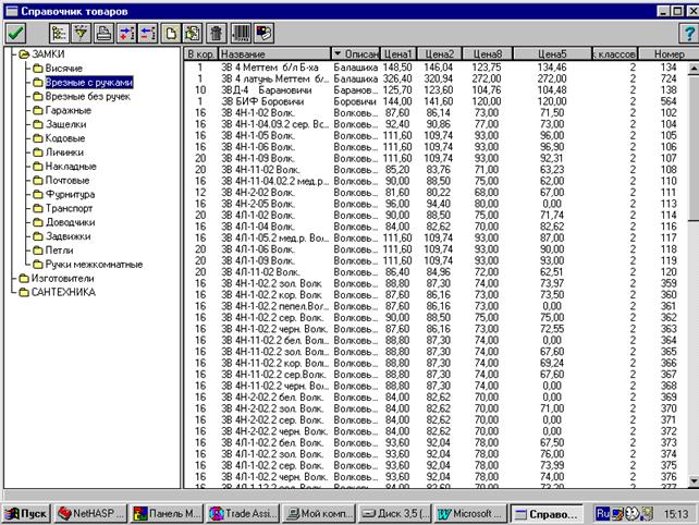 Рис. 7. Настройка Trade Assistant на ООО «Мастер-СД» 2. Заполнение справочников "Товары", "Контрагенты", "Склады", "Расчетные счета"; Товары и услуги Справочник товаров содержит всю номенклатуру замков, которыми торгует данная компания. Он используется при выполнении всех товарных операций. Каждая запись справочника содержит следующие поля: артикул товара, категория товара, тип, название и описание товара, штрихкод, единица измерения и дата последней модификации записи. Кроме того, справочник содержит 8 полей для указания цен реализации товара, что дает возможность устанавливать различные цены для различных групп покупателей. Справочник товаров в ООО «Мастер-СД» подразделен на висячие замки, врезные без ручек, врезные с ручками, гаражные защелки, кодовые, личинки, накладные, почтовые, фурнитуру. Справочник покупателей, в свою очередь, содержит поле с номером колонки прейскуранта, по которой с этим покупателем ведется торговля. При выполнении операции Продажа товаров этот номер определяет цену реализации, которая будет автоматически проставлена в документе. При работе со справочником товаров можно использовать классификатор товар неограниченной глубины вложенности. Классификатор дает возможность структурировать номенклатуру товаров, что существенно облегчает поиск товаров и ускоряет оформление документов при большой номенклатуре. Классификатор создается как отдельная надстройка над номенклатурой товаров. Товары могут быть включены в классы или подклассы любого уровня. Один и тот же товар может быть включен сразу в несколько классов классификатора. Такой подход облегчает пользователю поиск товаров в классификаторе. Различные пользователи могут иметь разные представления о классификации товаров, и способ классификации, естественный для одного пользователя, может поставить в тупик другого. Возможность включать товар в классификатор несколько раз дает возможность при создании классификатора совместить различные способы классификации. Классификатор используется при включении товарных позиций в документы: накладные, счета и др. При этом пользователь может легко отключить использование классификатора и воспользоваться неструктурированным списком товаров. При наборе документа пользователь может несколько раз переключать способ выбора товаров: с использованием классификатора и без него. Таблица 2. Структура справочника «Товары»