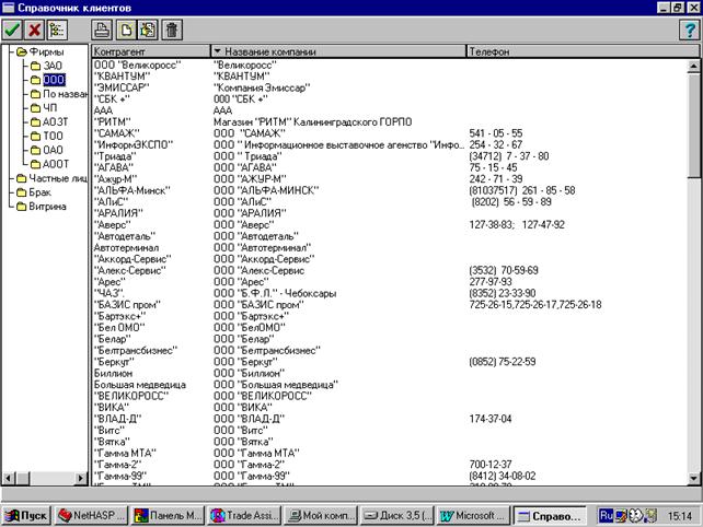 В этом справочнике содержится информация о всех партнерах, с которыми торгует компания. Каждая запись этого справочника содержит всю необходимую информацию о партнере: название компании (или фамилию контрагента, если это частное лицо), почтовый адрес, телефон, факс, категорию контрагента. Справочник контрагентов ООО «Мастер-СД» подразделен на фирмы и частных лиц. В свою очередь, фирмы подразделены на ЗАО, ООО, по названию, ЧП, АОЗТ, ТОО, ОАО, АООТ. Для каждого партнера система Trade Assistant дает возможность установить индивидуальные условия работы. Так, в карточке клиента можно установить колонку, по которой обычно фирма торгует с этим клиентом – в этом случае при выписке счетов и накладных цены будут проставляться автоматически в соответствии с установленной колонкой. Можно установить кредитную линию – система сама будет следить, чтобы долг клиента не превысил установленного максимума. Можно установить отсрочку платежа – и этот срок будет автоматически проставляться в счетах. Справочник контрагентов содержит также всю необходимую информацию для того, чтобы подсчитать полный баланс контрагента: сумму, на которую ему были отпущены товары и количество денег, заплаченных за эти товары, если контрагент является покупателем, и, наоборот, сумму, на которую контрагент отпустил товаров компании и количество денег, заплаченных за эти товары, если контрагент является поставщиком. При выполнении основных операций эти величины будут постоянно корректироваться, и баланс контрагента будет пересчитываться. При работе со справочником контрагентов можно также использовать классификатор.