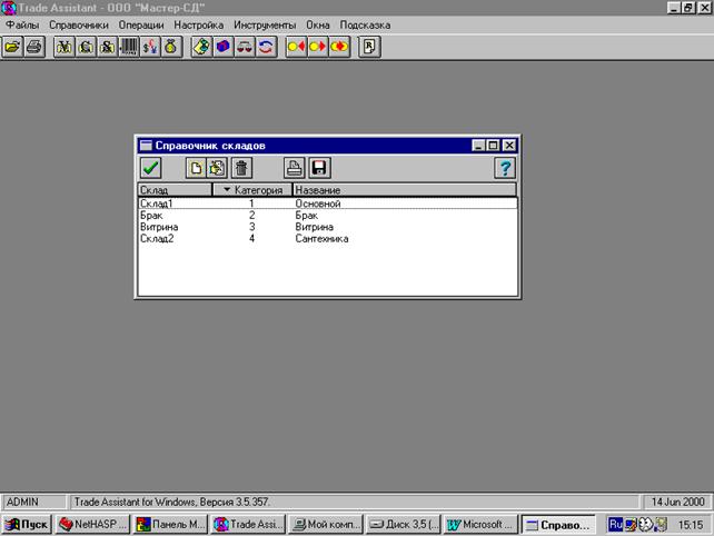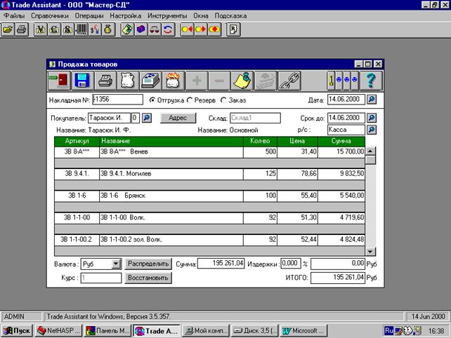 Рис. 6. Структурная схема организации учета продаж в ООО "Мастер-СД” Trade Assistant представляет собой комплексную систему управления торговой организацией. Он предназначен для оперативного управления и контроля за состоянием товарно-материальных запасов на складах и денежных средств на расчетных счетах, ведения полного баланса с партнерами, а также для всестороннего анализа информации, накопленной в базе данных системы. Компьютеры отдела закупок и сбыта, отдела выписки и кассы объединены в локальную сеть. В ее возможности входит: - Подготовка документов на поставку и отпуск товаров в формате, заданном пользователем; - Резервирование товаров на складе при выписке счетов; - Возможность отследить сроки оплаты выписанных счетов; - Регистрация пользователей при оформлении всех документов; - Развитая система разграничения доступа; - Работа в различных валютах и гибкость при учете меняющегося курса валют; - Получение справок по наличию и движению товаров; - Ведение полного баланса с партнерами и анализ динамики отношений с ними; - Классификатор товаров и клиентов неограниченной глубины вложенности; - Ведение многоколоночного прайс-листа и гибкая система скидок; - Средства работы с услугами; - Анализ движения товаров по складам, группам товаров, поставщикам, покупателям и т.д.; - Анализ эффективности работы персонала; - Расчет прибыли и рентабельности в целом по компании и отдельно по складам, по товарам, по группам товаров и т.д.; - Экспорт и импорт данных в формате CSV, обеспечивающий интерфейс с другими системами; - Разнообразная настройка справочных таблиц с использованием фильтров, сортировки данных, редактированием набора колонок; - Настройка базы данных на специфику пользователя; - Возможность самостоятельно создавать и редактировать бланки выходных документов и включать в них графические и сканированные изображения, формулы и таблицы. При продаже товаров можно оформить документы трех типов: предварительный заказ, резерв, отгрузка. При предварительном заказе не обязательно наличие товара на складе и не происходит резервирование заказанных товаров. При оформлении резерва также не обязательно наличие необходимого количества товара на складе, но заказанный товар резервируется. При оформлении накладной, напротив, необходимо наличие достаточного количества товара на складе, в противном случае Trade Assistant не позволит завершить операцию и выдаст сообщение об ошибке. При оформлении накладной происходит списание товара со склада по средневзвешенной цене. Общая сумма накладной записывается также на баланс клиенту. Все три типа документов легко могут быть преобразованы один в другой. Если предварительный заказ преобразовывается в резерв или накладную, то заказанный товар соответственно резервируется или списывается со склада. При преобразовании накладной в резерв или предварительный заказ товар снова приходуется на склад. Из одного документа на резервирование может быть сделано несколько накладных. При оформлении накладных система следит за тем, чтобы товар, указанный в накладной, присутствовал в достаточном количестве на складе, а также за тем, чтобы не был превышен кредит, установленный для каждого покупателя. При продаже товаров пользователь имеет оперативную информацию о том, когда и на кого был зарезервирован требуемый т