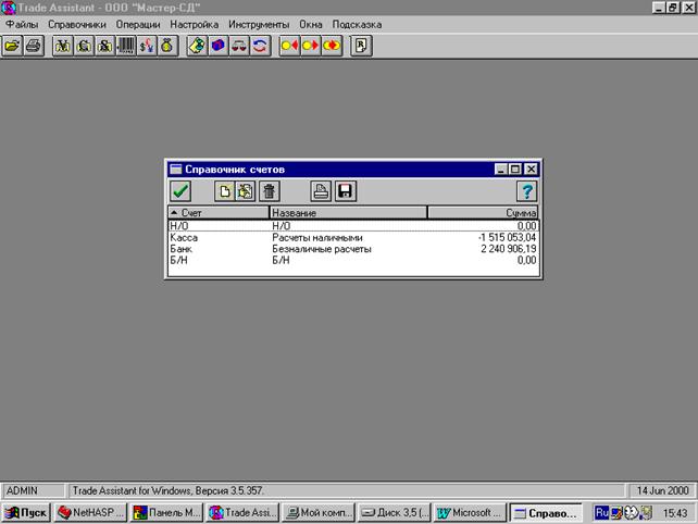 При оформлении любого документа обязательно должен быть указан расчетный счет. В справочник счетов удобно включить несколько расчетных счетов, и при оформлении документа каждый раз выбирать требуемый счет. Тогда легко можно отделить, например, товары, закупленные или проданные за наличные деньги, от товаров, прошедших по безналичному расчету. Для этого введен специальный счет Касса , по которому проводятся документы, за которые было заплачено наличными деньгами. При просмотре базы данных и при получении отчетов всегда можно отделить эти товары. Кроме того, всегда под рукой находится информация о том, сколько денег находится в кассе, сколько на счете в банке и т.д.