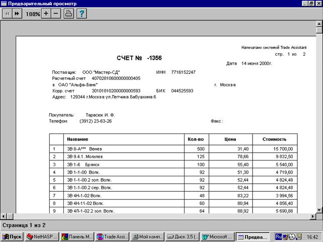 Рис. 12. Продажа товаров в ООО "Мастер-СД" 5. Формирование различных печатных форм первичных документов форм, таких как: - счет; - накладная; - счет-фактура; - если покупатель – организация, то заключается договор купли-продажи. Наиболее существенные моменты организации компьютерного учета реализации продукции – это порядок выписки расчетного документа (счета на оплату продукции) и способы отражения операций, связанных с отгрузкой продукции покупателю. Для выписки счета можно воспользоваться готовой формой. Для этого следует обратиться к справочнику «Продажа товаров» и перевести документ из "Отгрузки" в "Резерв". Новую организацию можно ввести, непосредственно работая с документом. Учитывая, что в "Trade Assistant" предусмотрена двухуровневая аналитика, на втором уровне следует указать основные атрибуты расчетного документа – счета (номер и дата выписки счета). В табличную часть документа вводятся данные по наименованиям замков, ценам и количеству отгруженного товара. Суммы по каждой позиции и по счету в целом будут рассчитаны автоматически. Нажатием кнопки «Печать» сформировывается печатный образ документа. По кнопке «Картотека» выйдем в журнал операций, где сохранилась заголовочная запись этого документа.