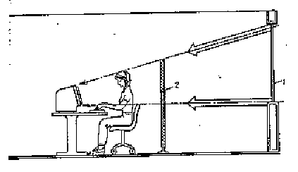 Экран АЦД, документы, клавиатура пульта должны быть расположены так, чтобы перепад яркостей их поверхностей, зависящий от их расположения относительно источников света, не превышал 1:10 при рекомендуемом значении 1:3. При яркости изображения на экране 50-100 кд/м (номинальное значение) освещенность документа должна составлять 300-500 лк. Должны быть исключены слепящие яркости, блики и отображения от стекла экрана. Для исключения засветки экранов дисплеев прямыми световыми потоками светильники общего освещения располагают сбоку от рабочего места, параллельно линии зрения оператора и стене с окнами. Также размещение светильников позволяет производить их последовательное включение в зависимости от величины естественной освещенности и исключает раздражение глаз чередующимися полосами света и тени, возникающее при поперечном расположении светильников. [17].