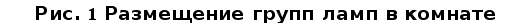 Для исключения засветки экранов дисплеев прямыми световыми потоками светильники общего освещения располагают сбоку от рабочего места, параллельно линии зрения оператора и стене с окнами. Такое размещение светильников позволяет производить их последовательное включение в зависимости от величины естественной освещённости и исключает раздражение глаз чередующимися полосами света и тени, возникающее при поперечном расположении светильников [17]. Расчёт местного светового потока не производится, т.к. в данном случае рекомендуется система общего освещения во избежание отражённой блёсткости от поверхности стола и экрана монитора. Коэффициент пульсации освещённости: