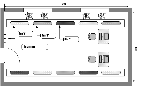 где Emax, Emin и Eср показатели освещённости для газоразрядных ламп при питании их переменным током – соответстсвенно максимальная, минимальная и средняя. Возьмём по аналогии [16], табл. 4 люминесцентную лампу ЛХБ приблизительно той же мощности. Включением смежных ламп в разные фазы (группы) трёхфазной электрической сети возможно добиться уменьшения коэффициента пульсации КП с 35 до 3 – т.е. почти в 12 раз (рис. 1). На рис. 1 указаны три выключателя (по одному на каждую фазу – группу ламп) – это необходимо для обеспечения возможности независимого управления группами ламп.