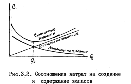 Если изобразить графически зависимость затрат на создание и содержание запасов от объема заказа Q (рис.3.2), то нетрудно убедиться, что суммарная кривая C(Q) имеет экстремум, положение которого определяется соответствующими значениями величин правой части соотношения (3.7). Определим оптимальный объем заказываемой партии Q0. из условия