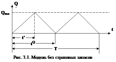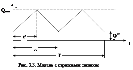 Модель со страховым запасом Графически действие этой модели изображено на рис.3.3., Привлекая рассуждения, которые использовались при рассмотрении предыдущей модели, нетрудно получить следующие результаты. Средее количество запаса Qср за цикл tQ составит