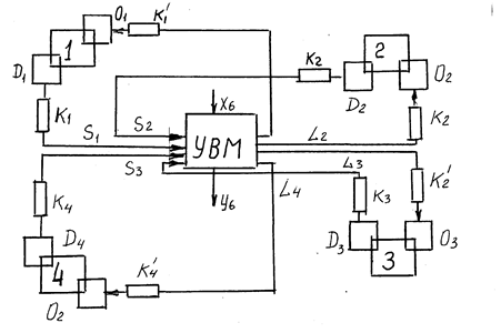 Как видно из структуры система состоит из управляющих устройств и управляемых объектов. Такое выделение приводит к упрощению исследования системы. Для управления современными объектами используется большое количество элементов (подсистем). Совокупность элементов, участвующих в управлении называется управляющим комплексом. Типичный управляющий комплекс состоит из элементов следующих типов (рис. 2): D – датчики осведомительной информации; S – средства передачи информации; L- управляющие элементы; O – органы управления;- k, k1 - различные преобразующие и переходные устройства