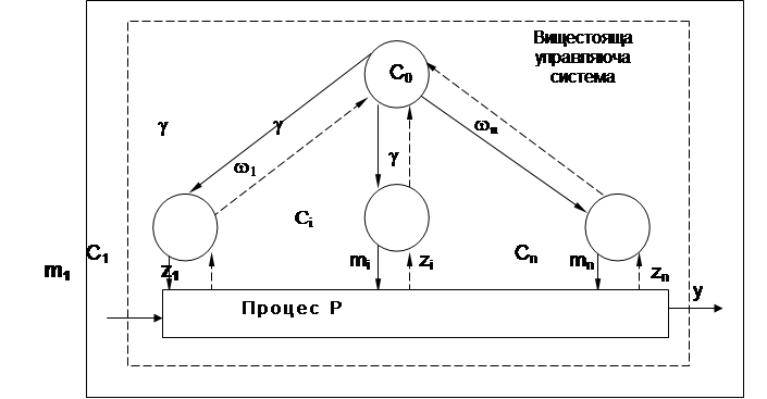 Рис. 5.1Р – процесс (управляющая система) С1…Сn – системы управления нижнего уровня С0 – управляющая система (координатор) m(m(M) - управляющие сигналы (входы) M - множество управляющих сигналов • w(wÎW ) - сигналы входы, представляющие собой внешние возмущения, поступающие из среды у( у( Y) - выход процесса Р У - множество входов процесса Р g(gÎj) - координирующий сигнал Zi - множество информационных сигналов (сигналов обратной связи). Тогда в системе выполняются следующие соотношения в виде отображения P: M x W ® Y; Ci: j x Zi ®Mi; C0:V®j; ¦i : M x W x Y® Zi; ¦0 : j x Z x M® w С учетом полученных отображений можно записать уравнение функции взаимодействия подпроцессов K(m, w)=H(m,P(m, w)) P(m, w)=(m,k(m, w),w) Взаимосвязь между процессом Р и "развязанными" подпроцессами, представленными блоком Р и связующими функциями показана на рис.5.2.