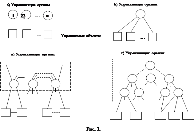 Рис. 2 Роль элемента каждого типа в процессе функционирования ясна из его названия. Управление сложной системой может быть централизованным и децентрализованным. Централизованное управление предполагает концентрацию функций управления в одном центре сложной системы. Такая структура обладает рядом достоинств: I) позволяет достаточно просто реализовать процессы информационного взаимодействия; 2) создает принципиальную возможность глобально-оптимального управления системой в целом; 3) исключает необходимость в пересылках промежуточных результатов; 4) позволяет легко корректировать оперативно-изменяемые данные; 5) дает возможность достигнуть максимальной эксплуатационной эффективности при минимальной избыточности технических средств. С системотехнической точки зрения основными недостатками структуры с единым управлением являются: необходимость исключительно высокого объема запоминающих устройств, высокой производительности и надежности средств обработки данных для достижения приемлемого качества управления; высокая суммарная протяженность каналов связи при наличии территориально-рассредоточенных объектов управления. Децентрализованное управление - распределение функций управления по отдельным элементам системы. Построение системы с такой структурой возможно только в случае независимости объектов управления по материальным, энергетическим, информационным ресурсам. Для выработки управляющего воздействия на каждый объект необходима информация о состоянии только этого объекта. Фактически такая система представляет собой совокупность нескольких независимых систем со своей информационной и алгоритмической базой. Процесс управления значительно упрощается при использовании системы управления с иерархической структурой. Для управления иерархической структуры характерно наличие нескольких уровней. управления. Типичным примером систем такого рода является административное управление. На рис-3 приведены классы структур.