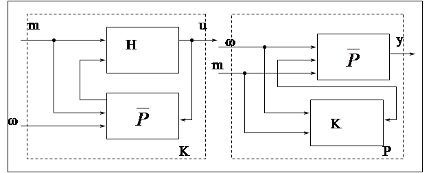 Рис.5.2 Сделаем несколько замечаний относительно процесса и его представления через процессы. 1. Каждая локальная управляющая система C1,C2…Cn заинтересована главным образом в каком нибудь одном направлении процесса, хотя окончательный результат ее действий зависит от всего процесса. 2. Связующие функции Hi предопределяют характер декомпозиции процесса, и обычно их следует выбирать по возможности простыми. 3. Функция взаимодействия К отражает весь процесс Р, так как для любого управляющего сигнала m и возмущающего воздействия W, к- определяет (поскольку k(m,w)=U связующие сигналы, которые поступают на вход подпроцессов Pi и кроме того, U = H(m,P(m,w) К может также рассматриваться как отображение подпроцесса. Рис.5.3