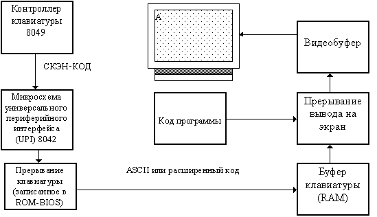 СКЭН-КОД - это однобайтовое число, младшие 7 бит которого представляют идентификационный номер, присвоенный каждой клавише. На материнской плате РС для подключения клавиатуры используется специальный контроллер. Для РС типа АТ обычно применяется микросхема универсального периферийного интерфейса. СКЭН-КОД поступает в контролер, процессор прекращает свою работу и выполняет процедуру, анализирующую СКЭН-КОД. Данное прерывание обслуживается специальной программой, входящей в состав ROM BIOS. Затем введённый код помещается в буфер клавиатуры, представляющий собой область памяти, способную запомнить до 15 вводимых символов, пока прикладная программа не может их обработать. Буфер организован по принципу FIFO (первый пришел - первый вышел). Каждая клавиша генерирует два типа СКЭН-КОДА: код нажатия, когда клавиша нажимается, и код освобождения, когда клавиша отпускается.